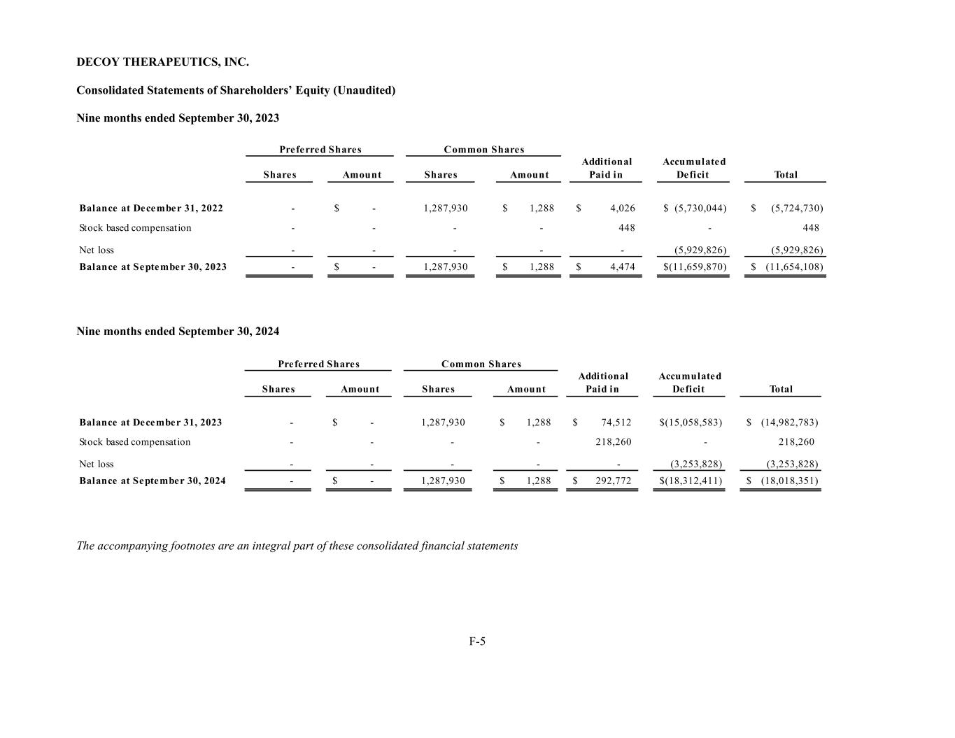 DECOY THERAPEUTICS, INC. F-5 Consolidated Statements of Shareholders’ Equity (Unaudited) Nine months ended September 30, 2023 Shares Amount Shares Amount Additional Paid in Accumulated Deficit Total Balance at December 31, 2022 - -$ 1,287,930 1,288$ 4,026$ (5,730,044)$ (5,724,730)$ Stock based compensation - - - - 448 - 448 Net loss - - - - - (5,929,826) (5,929,826) Balance at September 30, 2023 - -$ 1,287,930 1,288$ 4,474$ (11,659,870)$ (11,654,108)$ Preferred Shares Common Shares Nine months ended September 30, 2024 Shares Amount Shares Amount Additional Paid in Accumulated Deficit Total Balance at December 31, 2023 - -$ 1,287,930 1,288$ 74,512$ (15,058,583)$ (14,982,783)$ Stock based compensation - - - - 218,260 - 218,260 Net loss - - - - - (3,253,828) (3,253,828) Balance at September 30, 2024 - -$ 1,287,930 1,288$ 292,772$ (18,312,411)$ (18,018,351)$ Preferred Shares Common Shares The accompanying footnotes are an integral part of these consolidated financial statements