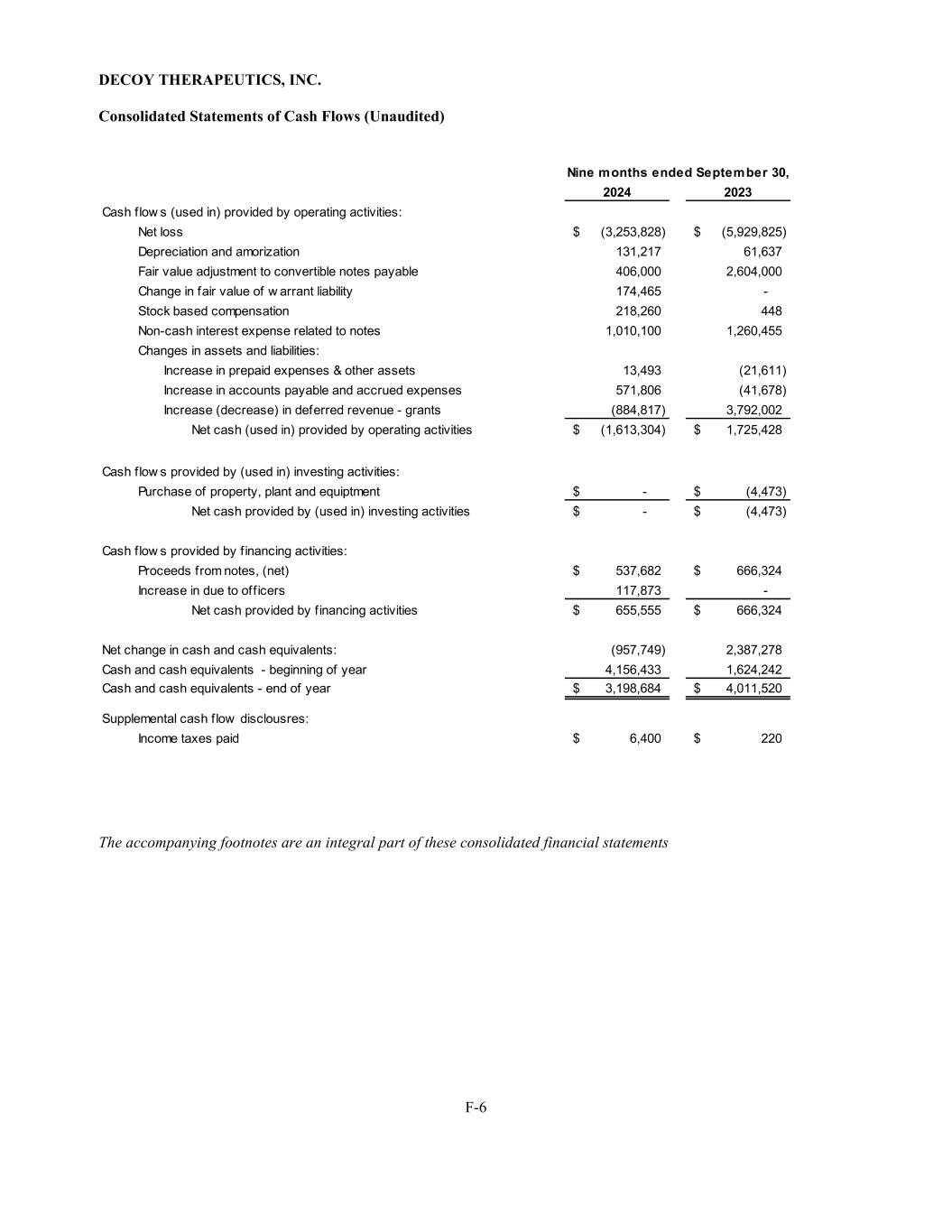 DECOY THERAPEUTICS, INC. F-6 Consolidated Statements of Cash Flows (Unaudited) 2024 2023 Cash flow s (used in) provided by operating activities: Net loss (3,253,828)$ (5,929,825)$ Depreciation and amorization 131,217 61,637 Fair value adjustment to convertible notes payable 406,000 2,604,000 Change in fair value of w arrant liability 174,465 - Stock based compensation 218,260 448 Non-cash interest expense related to notes 1,010,100 1,260,455 Changes in assets and liabilities: Increase in prepaid expenses & other assets 13,493 (21,611) Increase in accounts payable and accrued expenses 571,806 (41,678) Increase (decrease) in deferred revenue - grants (884,817) 3,792,002 Net cash (used in) provided by operating activities (1,613,304)$ 1,725,428$ Cash f low s provided by (used in) investing activities: Purchase of property, plant and equiptment -$ (4,473)$ Net cash provided by (used in) investing activities -$ (4,473)$ Cash f low s provided by f inancing activities: Proceeds from notes, (net) 537,682$ 666,324$ Increase in due to off icers 117,873 - Net cash provided by f inancing activities 655,555$ 666,324$ Net change in cash and cash equivalents: (957,749) 2,387,278 Cash and cash equivalents - beginning of year 4,156,433 1,624,242 Cash and cash equivalents - end of year 3,198,684$ 4,011,520$ Supplemental cash f low disclousres: Income taxes paid 6,400$ 220$ Nine months ended September 30, The accompanying footnotes are an integral part of these consolidated financial statements