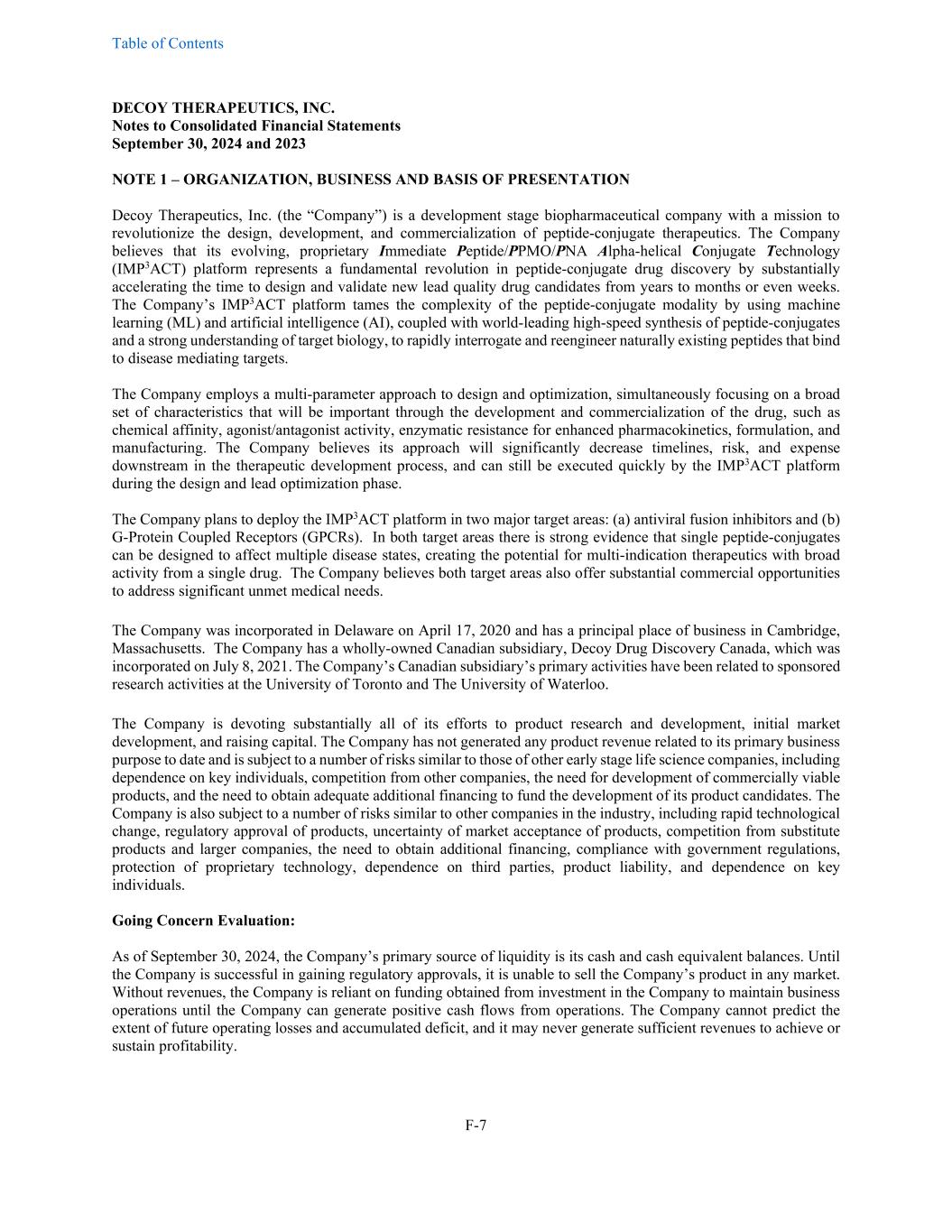 Table of Contents DECOY THERAPEUTICS, INC. Notes to Consolidated Financial Statements September 30, 2024 and 2023 F-7 NOTE 1 – ORGANIZATION, BUSINESS AND BASIS OF PRESENTATION Decoy Therapeutics, Inc. (the “Company”) is a development stage biopharmaceutical company with a mission to revolutionize the design, development, and commercialization of peptide-conjugate therapeutics. The Company believes that its evolving, proprietary Immediate Peptide/PPMO/PNA Alpha-helical Conjugate Technology (IMP3ACT) platform represents a fundamental revolution in peptide-conjugate drug discovery by substantially accelerating the time to design and validate new lead quality drug candidates from years to months or even weeks. The Company’s IMP3ACT platform tames the complexity of the peptide-conjugate modality by using machine learning (ML) and artificial intelligence (AI), coupled with world-leading high-speed synthesis of peptide-conjugates and a strong understanding of target biology, to rapidly interrogate and reengineer naturally existing peptides that bind to disease mediating targets. The Company employs a multi-parameter approach to design and optimization, simultaneously focusing on a broad set of characteristics that will be important through the development and commercialization of the drug, such as chemical affinity, agonist/antagonist activity, enzymatic resistance for enhanced pharmacokinetics, formulation, and manufacturing. The Company believes its approach will significantly decrease timelines, risk, and expense downstream in the therapeutic development process, and can still be executed quickly by the IMP3ACT platform during the design and lead optimization phase. The Company plans to deploy the IMP3ACT platform in two major target areas: (a) antiviral fusion inhibitors and (b) G-Protein Coupled Receptors (GPCRs). In both target areas there is strong evidence that single peptide-conjugates can be designed to affect multiple disease states, creating the potential for multi-indication therapeutics with broad activity from a single drug. The Company believes both target areas also offer substantial commercial opportunities to address significant unmet medical needs. The Company was incorporated in Delaware on April 17, 2020 and has a principal place of business in Cambridge, Massachusetts. The Company has a wholly-owned Canadian subsidiary, Decoy Drug Discovery Canada, which was incorporated on July 8, 2021. The Company’s Canadian subsidiary’s primary activities have been related to sponsored research activities at the University of Toronto and The University of Waterloo. The Company is devoting substantially all of its efforts to product research and development, initial market development, and raising capital. The Company has not generated any product revenue related to its primary business purpose to date and is subject to a number of risks similar to those of other early stage life science companies, including dependence on key individuals, competition from other companies, the need for development of commercially viable products, and the need to obtain adequate additional financing to fund the development of its product candidates. The Company is also subject to a number of risks similar to other companies in the industry, including rapid technological change, regulatory approval of products, uncertainty of market acceptance of products, competition from substitute products and larger companies, the need to obtain additional financing, compliance with government regulations, protection of proprietary technology, dependence on third parties, product liability, and dependence on key individuals. Going Concern Evaluation: As of September 30, 2024, the Company’s primary source of liquidity is its cash and cash equivalent balances. Until the Company is successful in gaining regulatory approvals, it is unable to sell the Company’s product in any market. Without revenues, the Company is reliant on funding obtained from investment in the Company to maintain business operations until the Company can generate positive cash flows from operations. The Company cannot predict the extent of future operating losses and accumulated deficit, and it may never generate sufficient revenues to achieve or sustain profitability.