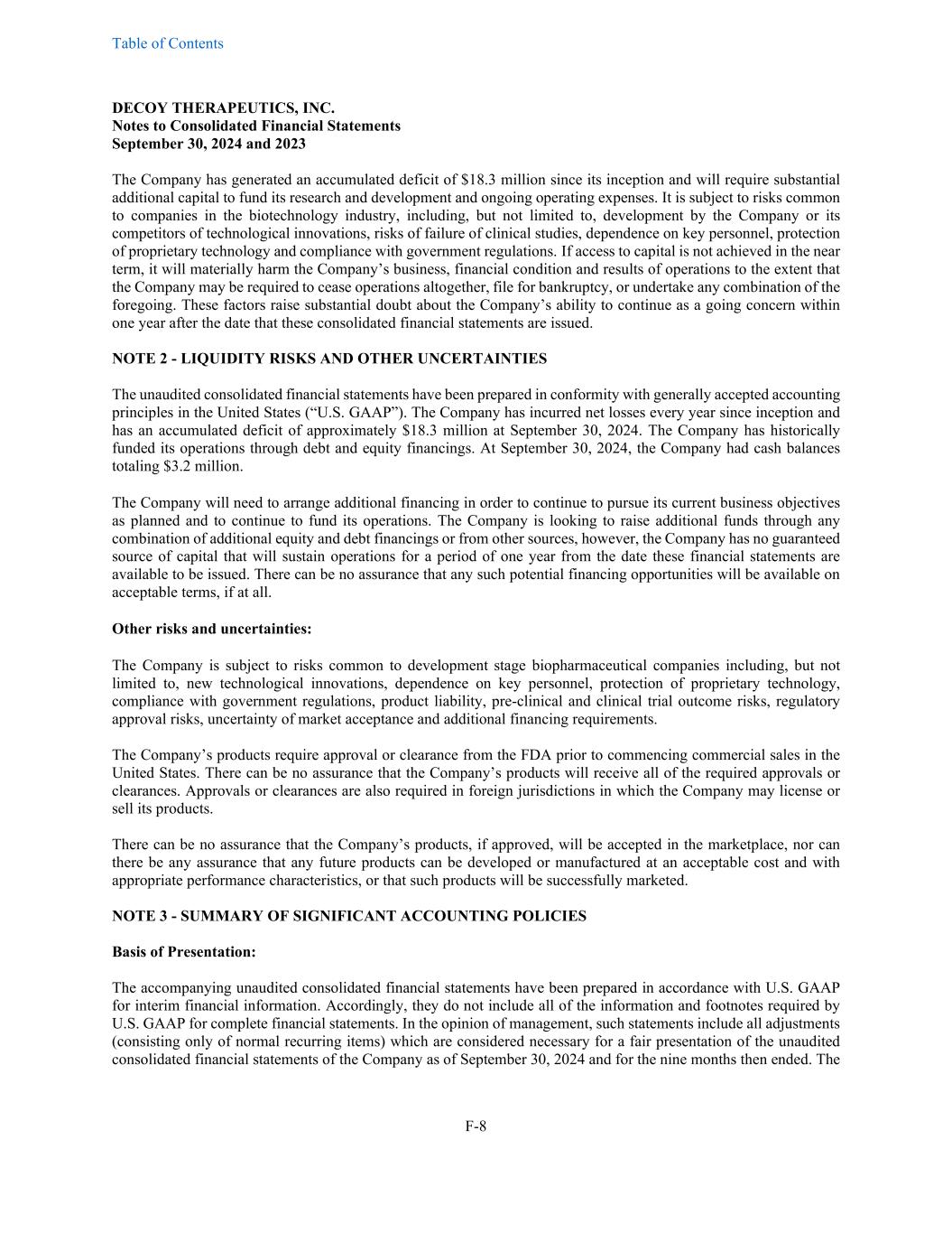 Table of Contents DECOY THERAPEUTICS, INC. Notes to Consolidated Financial Statements September 30, 2024 and 2023 F-8 The Company has generated an accumulated deficit of $18.3 million since its inception and will require substantial additional capital to fund its research and development and ongoing operating expenses. It is subject to risks common to companies in the biotechnology industry, including, but not limited to, development by the Company or its competitors of technological innovations, risks of failure of clinical studies, dependence on key personnel, protection of proprietary technology and compliance with government regulations. If access to capital is not achieved in the near term, it will materially harm the Company’s business, financial condition and results of operations to the extent that the Company may be required to cease operations altogether, file for bankruptcy, or undertake any combination of the foregoing. These factors raise substantial doubt about the Company’s ability to continue as a going concern within one year after the date that these consolidated financial statements are issued. NOTE 2 - LIQUIDITY RISKS AND OTHER UNCERTAINTIES The unaudited consolidated financial statements have been prepared in conformity with generally accepted accounting principles in the United States (“U.S. GAAP”). The Company has incurred net losses every year since inception and has an accumulated deficit of approximately $18.3 million at September 30, 2024. The Company has historically funded its operations through debt and equity financings. At September 30, 2024, the Company had cash balances totaling $3.2 million. The Company will need to arrange additional financing in order to continue to pursue its current business objectives as planned and to continue to fund its operations. The Company is looking to raise additional funds through any combination of additional equity and debt financings or from other sources, however, the Company has no guaranteed source of capital that will sustain operations for a period of one year from the date these financial statements are available to be issued. There can be no assurance that any such potential financing opportunities will be available on acceptable terms, if at all. Other risks and uncertainties: The Company is subject to risks common to development stage biopharmaceutical companies including, but not limited to, new technological innovations, dependence on key personnel, protection of proprietary technology, compliance with government regulations, product liability, pre-clinical and clinical trial outcome risks, regulatory approval risks, uncertainty of market acceptance and additional financing requirements. The Company’s products require approval or clearance from the FDA prior to commencing commercial sales in the United States. There can be no assurance that the Company’s products will receive all of the required approvals or clearances. Approvals or clearances are also required in foreign jurisdictions in which the Company may license or sell its products. There can be no assurance that the Company’s products, if approved, will be accepted in the marketplace, nor can there be any assurance that any future products can be developed or manufactured at an acceptable cost and with appropriate performance characteristics, or that such products will be successfully marketed. NOTE 3 - SUMMARY OF SIGNIFICANT ACCOUNTING POLICIES Basis of Presentation: The accompanying unaudited consolidated financial statements have been prepared in accordance with U.S. GAAP for interim financial information. Accordingly, they do not include all of the information and footnotes required by U.S. GAAP for complete financial statements. In the opinion of management, such statements include all adjustments (consisting only of normal recurring items) which are considered necessary for a fair presentation of the unaudited consolidated financial statements of the Company as of September 30, 2024 and for the nine months then ended. The