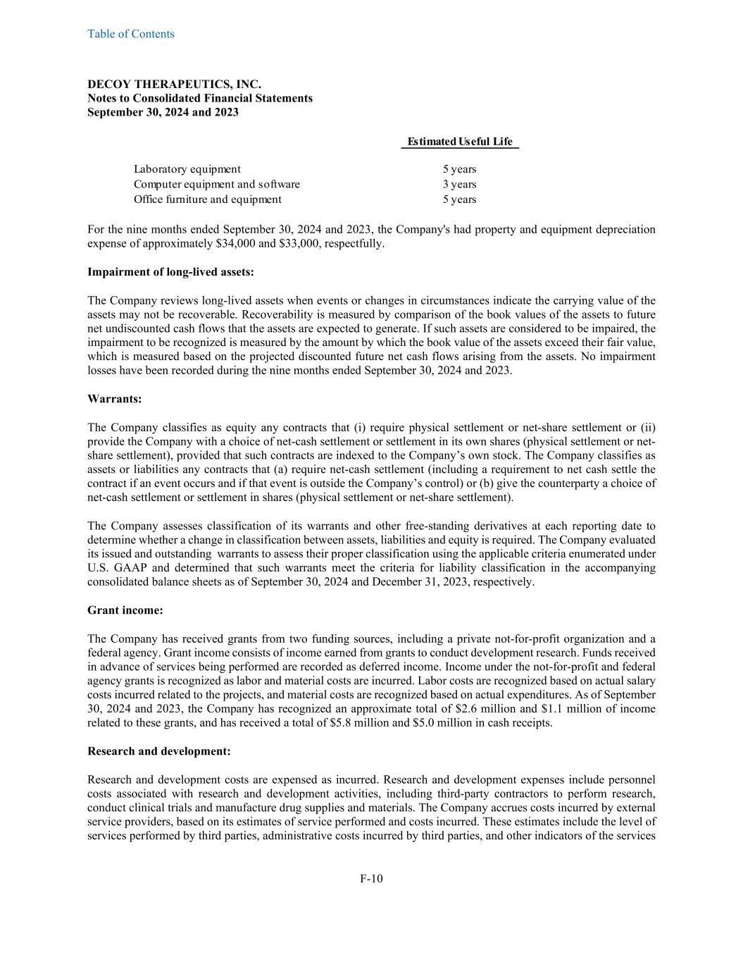 Table of Contents DECOY THERAPEUTICS, INC. Notes to Consolidated Financial Statements September 30, 2024 and 2023 F-10 Estimated Useful Life Laboratory equipment 5 years Computer equipment and software 3 years Office furniture and equipment 5 years For the nine months ended September 30, 2024 and 2023, the Company's had property and equipment depreciation expense of approximately $34,000 and $33,000, respectfully. Impairment of long-lived assets: The Company reviews long-lived assets when events or changes in circumstances indicate the carrying value of the assets may not be recoverable. Recoverability is measured by comparison of the book values of the assets to future net undiscounted cash flows that the assets are expected to generate. If such assets are considered to be impaired, the impairment to be recognized is measured by the amount by which the book value of the assets exceed their fair value, which is measured based on the projected discounted future net cash flows arising from the assets. No impairment losses have been recorded during the nine months ended September 30, 2024 and 2023. Warrants: The Company classifies as equity any contracts that (i) require physical settlement or net-share settlement or (ii) provide the Company with a choice of net-cash settlement or settlement in its own shares (physical settlement or net- share settlement), provided that such contracts are indexed to the Company’s own stock. The Company classifies as assets or liabilities any contracts that (a) require net-cash settlement (including a requirement to net cash settle the contract if an event occurs and if that event is outside the Company’s control) or (b) give the counterparty a choice of net-cash settlement or settlement in shares (physical settlement or net-share settlement). The Company assesses classification of its warrants and other free-standing derivatives at each reporting date to determine whether a change in classification between assets, liabilities and equity is required. The Company evaluated its issued and outstanding warrants to assess their proper classification using the applicable criteria enumerated under U.S. GAAP and determined that such warrants meet the criteria for liability classification in the accompanying consolidated balance sheets as of September 30, 2024 and December 31, 2023, respectively. Grant income: The Company has received grants from two funding sources, including a private not-for-profit organization and a federal agency. Grant income consists of income earned from grants to conduct development research. Funds received in advance of services being performed are recorded as deferred income. Income under the not-for-profit and federal agency grants is recognized as labor and material costs are incurred. Labor costs are recognized based on actual salary costs incurred related to the projects, and material costs are recognized based on actual expenditures. As of September 30, 2024 and 2023, the Company has recognized an approximate total of $2.6 million and $1.1 million of income related to these grants, and has received a total of $5.8 million and $5.0 million in cash receipts. Research and development: Research and development costs are expensed as incurred. Research and development expenses include personnel costs associated with research and development activities, including third-party contractors to perform research, conduct clinical trials and manufacture drug supplies and materials. The Company accrues costs incurred by external service providers, based on its estimates of service performed and costs incurred. These estimates include the level of services performed by third parties, administrative costs incurred by third parties, and other indicators of the services