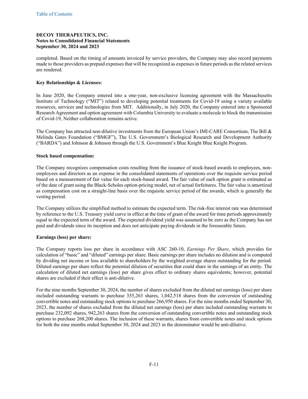 Table of Contents DECOY THERAPEUTICS, INC. Notes to Consolidated Financial Statements September 30, 2024 and 2023 F-11 completed. Based on the timing of amounts invoiced by service providers, the Company may also record payments made to those providers as prepaid expenses that will be recognized as expenses in future periods as the related services are rendered. Key Relationships & Licenses: In June 2020, the Company entered into a one-year, non-exclusive licensing agreement with the Massachusetts Institute of Technology (“MIT”) related to developing potential treatments for Covid-19 using a variety available resources, services and technologies from MIT. Additionally, in July 2020, the Company entered into a Sponsored Research Agreement and option agreement with Columbia University to evaluate a molecule to block the transmission of Covid-19, Neither collaboration remains active. The Company has attracted non-dilutive investments from the European Union’s IMI-CARE Consortium, The Bill & Melinda Gates Foundation (“BMGF”), The U.S. Government’s Biological Research and Development Authority (“BARDA”) and Johnson & Johnson through the U.S. Government’s Blue Knight Blue Knight Program. Stock based compensation: The Company recognizes compensation costs resulting from the issuance of stock-based awards to employees, non- employees and directors as an expense in the consolidated statements of operations over the requisite service period based on a measurement of fair value for each stock-based award. The fair value of each option grant is estimated as of the date of grant using the Black-Scholes option-pricing model, net of actual forfeitures. The fair value is amortized as compensation cost on a straight-line basis over the requisite service period of the awards, which is generally the vesting period. The Company utilizes the simplified method to estimate the expected term. The risk-free interest rate was determined by reference to the U.S. Treasury yield curve in effect at the time of grant of the award for time periods approximately equal to the expected term of the award. The expected dividend yield was assumed to be zero as the Company has not paid and dividends since its inception and does not anticipate paying dividends in the foreseeable future. Earnings (loss) per share: The Company reports loss per share in accordance with ASC 260-10, Earnings Per Share, which provides for calculation of “basic” and “diluted” earnings per share. Basic earnings per share includes no dilution and is computed by dividing net income or loss available to shareholders by the weighted average shares outstanding for the period. Diluted earnings per share reflect the potential dilution of securities that could share in the earnings of an entity. The calculation of diluted net earnings (loss) per share gives effect to ordinary shares equivalents; however, potential shares are excluded if their effect is anti-dilutive. For the nine months September 30, 2024, the number of shares excluded from the diluted net earnings (loss) per share included outstanding warrants to purchase 355,263 shares, 1,042,518 shares from the conversion of outstanding convertible notes and outstanding stock options to purchase 266,950 shares. For the nine months ended September 30, 2023, the number of shares excluded from the diluted net earnings (loss) per share included outstanding warrants to purchase 232,092 shares, 942,263 shares from the conversion of outstanding convertible notes and outstanding stock options to purchase 268,200 shares. The inclusion of these warrants, shares from convertible notes and stock options for both the nine months ended September 30, 2024 and 2023 in the denominator would be anti-dilutive.