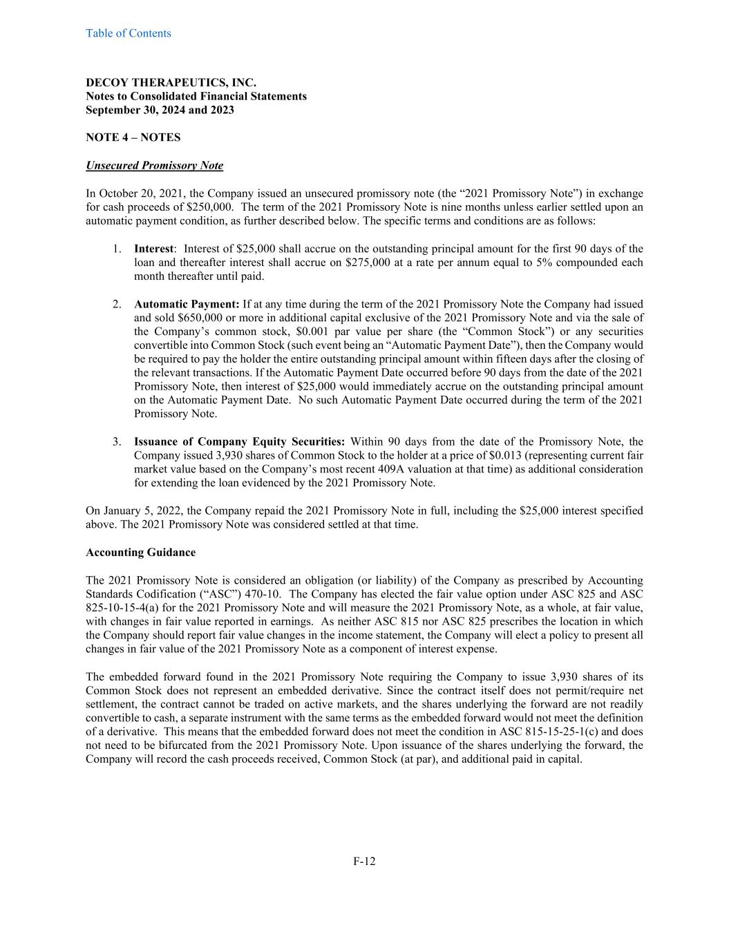 Table of Contents DECOY THERAPEUTICS, INC. Notes to Consolidated Financial Statements September 30, 2024 and 2023 F-12 NOTE 4 – NOTES Unsecured Promissory Note In October 20, 2021, the Company issued an unsecured promissory note (the “2021 Promissory Note”) in exchange for cash proceeds of $250,000. The term of the 2021 Promissory Note is nine months unless earlier settled upon an automatic payment condition, as further described below. The specific terms and conditions are as follows: 1. Interest: Interest of $25,000 shall accrue on the outstanding principal amount for the first 90 days of the loan and thereafter interest shall accrue on $275,000 at a rate per annum equal to 5% compounded each month thereafter until paid. 2. Automatic Payment: If at any time during the term of the 2021 Promissory Note the Company had issued and sold $650,000 or more in additional capital exclusive of the 2021 Promissory Note and via the sale of the Company’s common stock, $0.001 par value per share (the “Common Stock”) or any securities convertible into Common Stock (such event being an “Automatic Payment Date”), then the Company would be required to pay the holder the entire outstanding principal amount within fifteen days after the closing of the relevant transactions. If the Automatic Payment Date occurred before 90 days from the date of the 2021 Promissory Note, then interest of $25,000 would immediately accrue on the outstanding principal amount on the Automatic Payment Date. No such Automatic Payment Date occurred during the term of the 2021 Promissory Note. 3. Issuance of Company Equity Securities: Within 90 days from the date of the Promissory Note, the Company issued 3,930 shares of Common Stock to the holder at a price of $0.013 (representing current fair market value based on the Company’s most recent 409A valuation at that time) as additional consideration for extending the loan evidenced by the 2021 Promissory Note. On January 5, 2022, the Company repaid the 2021 Promissory Note in full, including the $25,000 interest specified above. The 2021 Promissory Note was considered settled at that time. Accounting Guidance The 2021 Promissory Note is considered an obligation (or liability) of the Company as prescribed by Accounting Standards Codification (“ASC”) 470-10. The Company has elected the fair value option under ASC 825 and ASC 825-10-15-4(a) for the 2021 Promissory Note and will measure the 2021 Promissory Note, as a whole, at fair value, with changes in fair value reported in earnings. As neither ASC 815 nor ASC 825 prescribes the location in which the Company should report fair value changes in the income statement, the Company will elect a policy to present all changes in fair value of the 2021 Promissory Note as a component of interest expense. The embedded forward found in the 2021 Promissory Note requiring the Company to issue 3,930 shares of its Common Stock does not represent an embedded derivative. Since the contract itself does not permit/require net settlement, the contract cannot be traded on active markets, and the shares underlying the forward are not readily convertible to cash, a separate instrument with the same terms as the embedded forward would not meet the definition of a derivative. This means that the embedded forward does not meet the condition in ASC 815-15-25-1(c) and does not need to be bifurcated from the 2021 Promissory Note. Upon issuance of the shares underlying the forward, the Company will record the cash proceeds received, Common Stock (at par), and additional paid in capital.
