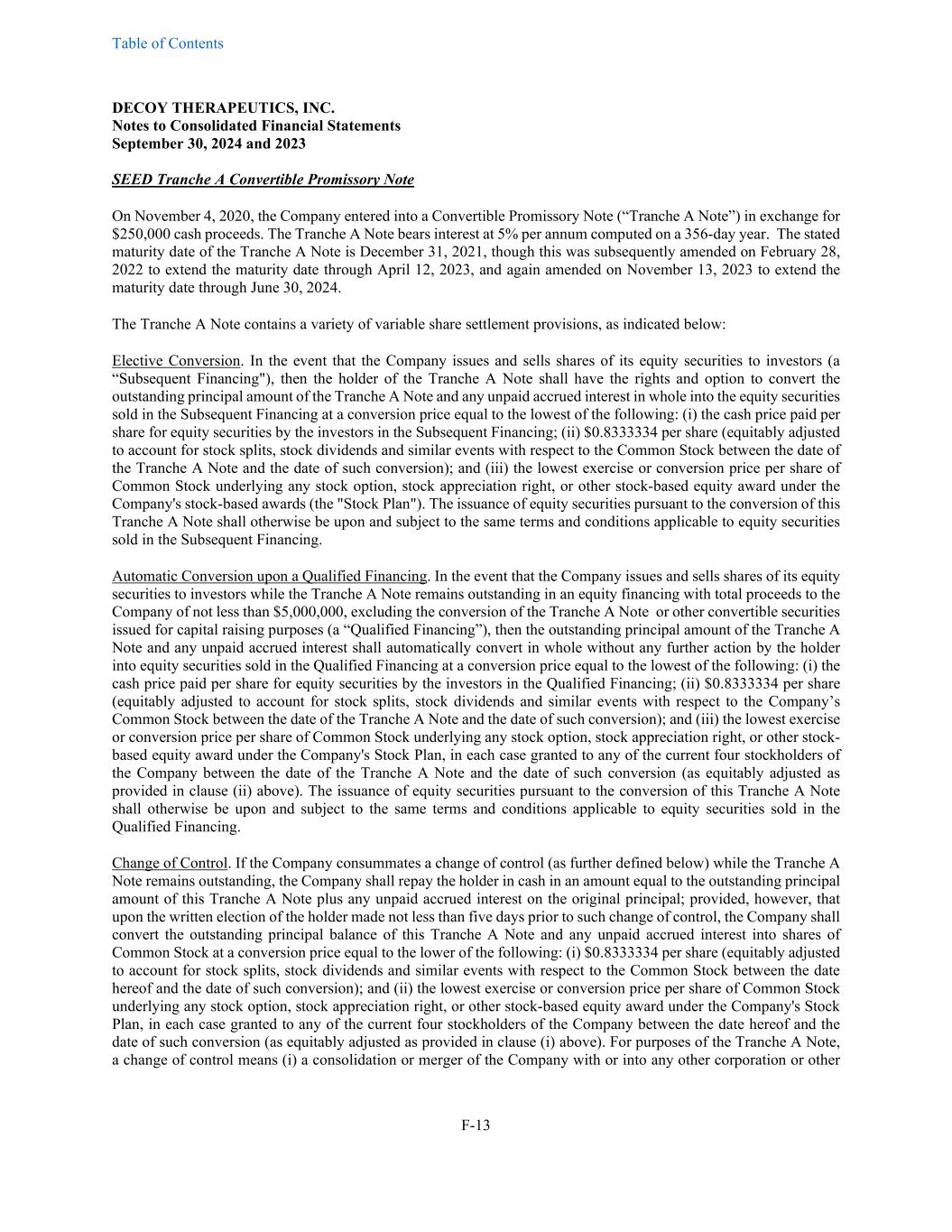 Table of Contents DECOY THERAPEUTICS, INC. Notes to Consolidated Financial Statements September 30, 2024 and 2023 F-13 SEED Tranche A Convertible Promissory Note On November 4, 2020, the Company entered into a Convertible Promissory Note (“Tranche A Note”) in exchange for $250,000 cash proceeds. The Tranche A Note bears interest at 5% per annum computed on a 356-day year. The stated maturity date of the Tranche A Note is December 31, 2021, though this was subsequently amended on February 28, 2022 to extend the maturity date through April 12, 2023, and again amended on November 13, 2023 to extend the maturity date through June 30, 2024. The Tranche A Note contains a variety of variable share settlement provisions, as indicated below: Elective Conversion. In the event that the Company issues and sells shares of its equity securities to investors (a “Subsequent Financing"), then the holder of the Tranche A Note shall have the rights and option to convert the outstanding principal amount of the Tranche A Note and any unpaid accrued interest in whole into the equity securities sold in the Subsequent Financing at a conversion price equal to the lowest of the following: (i) the cash price paid per share for equity securities by the investors in the Subsequent Financing; (ii) $0.8333334 per share (equitably adjusted to account for stock splits, stock dividends and similar events with respect to the Common Stock between the date of the Tranche A Note and the date of such conversion); and (iii) the lowest exercise or conversion price per share of Common Stock underlying any stock option, stock appreciation right, or other stock-based equity award under the Company's stock-based awards (the "Stock Plan"). The issuance of equity securities pursuant to the conversion of this Tranche A Note shall otherwise be upon and subject to the same terms and conditions applicable to equity securities sold in the Subsequent Financing. Automatic Conversion upon a Qualified Financing. In the event that the Company issues and sells shares of its equity securities to investors while the Tranche A Note remains outstanding in an equity financing with total proceeds to the Company of not less than $5,000,000, excluding the conversion of the Tranche A Note or other convertible securities issued for capital raising purposes (a “Qualified Financing”), then the outstanding principal amount of the Tranche A Note and any unpaid accrued interest shall automatically convert in whole without any further action by the holder into equity securities sold in the Qualified Financing at a conversion price equal to the lowest of the following: (i) the cash price paid per share for equity securities by the investors in the Qualified Financing; (ii) $0.8333334 per share (equitably adjusted to account for stock splits, stock dividends and similar events with respect to the Company’s Common Stock between the date of the Tranche A Note and the date of such conversion); and (iii) the lowest exercise or conversion price per share of Common Stock underlying any stock option, stock appreciation right, or other stock- based equity award under the Company's Stock Plan, in each case granted to any of the current four stockholders of the Company between the date of the Tranche A Note and the date of such conversion (as equitably adjusted as provided in clause (ii) above). The issuance of equity securities pursuant to the conversion of this Tranche A Note shall otherwise be upon and subject to the same terms and conditions applicable to equity securities sold in the Qualified Financing. Change of Control. If the Company consummates a change of control (as further defined below) while the Tranche A Note remains outstanding, the Company shall repay the holder in cash in an amount equal to the outstanding principal amount of this Tranche A Note plus any unpaid accrued interest on the original principal; provided, however, that upon the written election of the holder made not less than five days prior to such change of control, the Company shall convert the outstanding principal balance of this Tranche A Note and any unpaid accrued interest into shares of Common Stock at a conversion price equal to the lower of the following: (i) $0.8333334 per share (equitably adjusted to account for stock splits, stock dividends and similar events with respect to the Common Stock between the date hereof and the date of such conversion); and (ii) the lowest exercise or conversion price per share of Common Stock underlying any stock option, stock appreciation right, or other stock-based equity award under the Company's Stock Plan, in each case granted to any of the current four stockholders of the Company between the date hereof and the date of such conversion (as equitably adjusted as provided in clause (i) above). For purposes of the Tranche A Note, a change of control means (i) a consolidation or merger of the Company with or into any other corporation or other