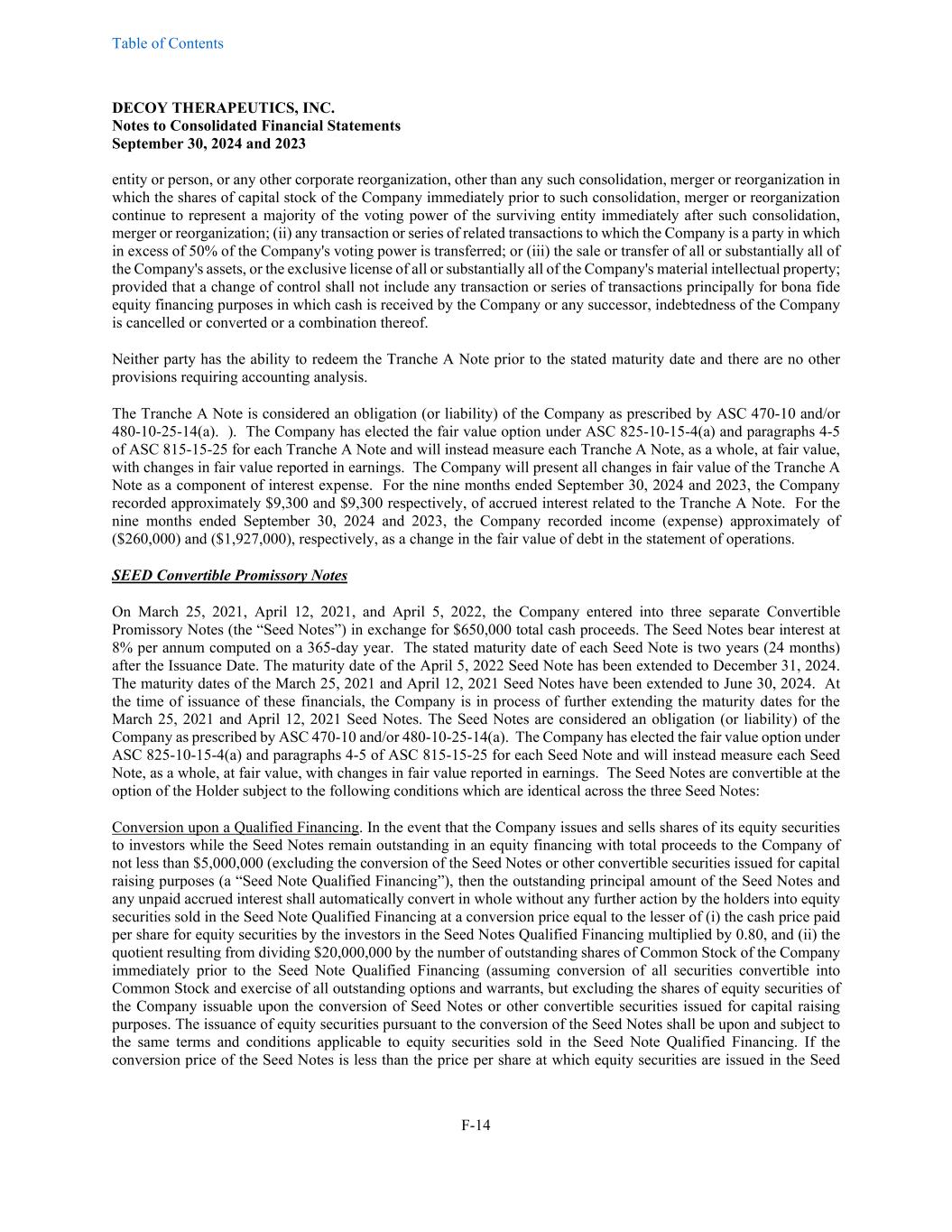 Table of Contents DECOY THERAPEUTICS, INC. Notes to Consolidated Financial Statements September 30, 2024 and 2023 F-14 entity or person, or any other corporate reorganization, other than any such consolidation, merger or reorganization in which the shares of capital stock of the Company immediately prior to such consolidation, merger or reorganization continue to represent a majority of the voting power of the surviving entity immediately after such consolidation, merger or reorganization; (ii) any transaction or series of related transactions to which the Company is a party in which in excess of 50% of the Company's voting power is transferred; or (iii) the sale or transfer of all or substantially all of the Company's assets, or the exclusive license of all or substantially all of the Company's material intellectual property; provided that a change of control shall not include any transaction or series of transactions principally for bona fide equity financing purposes in which cash is received by the Company or any successor, indebtedness of the Company is cancelled or converted or a combination thereof. Neither party has the ability to redeem the Tranche A Note prior to the stated maturity date and there are no other provisions requiring accounting analysis. The Tranche A Note is considered an obligation (or liability) of the Company as prescribed by ASC 470-10 and/or 480-10-25-14(a). ). The Company has elected the fair value option under ASC 825-10-15-4(a) and paragraphs 4-5 of ASC 815-15-25 for each Tranche A Note and will instead measure each Tranche A Note, as a whole, at fair value, with changes in fair value reported in earnings. The Company will present all changes in fair value of the Tranche A Note as a component of interest expense. For the nine months ended September 30, 2024 and 2023, the Company recorded approximately $9,300 and $9,300 respectively, of accrued interest related to the Tranche A Note. For the nine months ended September 30, 2024 and 2023, the Company recorded income (expense) approximately of ($260,000) and ($1,927,000), respectively, as a change in the fair value of debt in the statement of operations. SEED Convertible Promissory Notes On March 25, 2021, April 12, 2021, and April 5, 2022, the Company entered into three separate Convertible Promissory Notes (the “Seed Notes”) in exchange for $650,000 total cash proceeds. The Seed Notes bear interest at 8% per annum computed on a 365-day year. The stated maturity date of each Seed Note is two years (24 months) after the Issuance Date. The maturity date of the April 5, 2022 Seed Note has been extended to December 31, 2024. The maturity dates of the March 25, 2021 and April 12, 2021 Seed Notes have been extended to June 30, 2024. At the time of issuance of these financials, the Company is in process of further extending the maturity dates for the March 25, 2021 and April 12, 2021 Seed Notes. The Seed Notes are considered an obligation (or liability) of the Company as prescribed by ASC 470-10 and/or 480-10-25-14(a). The Company has elected the fair value option under ASC 825-10-15-4(a) and paragraphs 4-5 of ASC 815-15-25 for each Seed Note and will instead measure each Seed Note, as a whole, at fair value, with changes in fair value reported in earnings. The Seed Notes are convertible at the option of the Holder subject to the following conditions which are identical across the three Seed Notes: Conversion upon a Qualified Financing. In the event that the Company issues and sells shares of its equity securities to investors while the Seed Notes remain outstanding in an equity financing with total proceeds to the Company of not less than $5,000,000 (excluding the conversion of the Seed Notes or other convertible securities issued for capital raising purposes (a “Seed Note Qualified Financing”), then the outstanding principal amount of the Seed Notes and any unpaid accrued interest shall automatically convert in whole without any further action by the holders into equity securities sold in the Seed Note Qualified Financing at a conversion price equal to the lesser of (i) the cash price paid per share for equity securities by the investors in the Seed Notes Qualified Financing multiplied by 0.80, and (ii) the quotient resulting from dividing $20,000,000 by the number of outstanding shares of Common Stock of the Company immediately prior to the Seed Note Qualified Financing (assuming conversion of all securities convertible into Common Stock and exercise of all outstanding options and warrants, but excluding the shares of equity securities of the Company issuable upon the conversion of Seed Notes or other convertible securities issued for capital raising purposes. The issuance of equity securities pursuant to the conversion of the Seed Notes shall be upon and subject to the same terms and conditions applicable to equity securities sold in the Seed Note Qualified Financing. If the conversion price of the Seed Notes is less than the price per share at which equity securities are issued in the Seed
