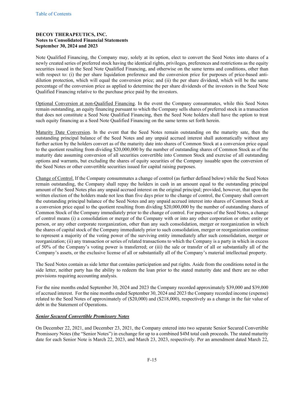 Table of Contents DECOY THERAPEUTICS, INC. Notes to Consolidated Financial Statements September 30, 2024 and 2023 F-15 Note Qualified Financing, the Company may, solely at its option, elect to convert the Seed Notes into shares of a newly created series of preferred stock having the identical rights, privileges, preferences and restrictions as the equity securities issued in the Seed Note Qualified Financing, and otherwise on the same terms and conditions, other than with respect to: (i) the per share liquidation preference and the conversion price for purposes of price-based anti- dilution protection, which will equal the conversion price; and (ii) the per share dividend, which will be the same percentage of the conversion price as applied to determine the per share dividends of the investors in the Seed Note Qualified Financing relative to the purchase price paid by the investors. Optional Conversion at non-Qualified Financing. In the event the Company consummates, while this Seed Notes remain outstanding, an equity financing pursuant to which the Company sells shares of preferred stock in a transaction that does not constitute a Seed Note Qualified Financing, then the Seed Note holders shall have the option to treat such equity financing as a Seed Note Qualified Financing on the same terms set forth herein. Maturity Date Conversion. In the event that the Seed Notes remain outstanding on the maturity sate, then the outstanding principal balance of the Seed Notes and any unpaid accrued interest shall automatically without any further action by the holders convert as of the maturity date into shares of Common Stock at a conversion price equal to the quotient resulting from dividing $20,000,000 by the number of outstanding shares of Common Stock as of the maturity date assuming conversion of all securities convertible into Common Stock and exercise of all outstanding options and warrants, but excluding the shares of equity securities of the Company issuable upon the conversion of the Seed Notes or other convertible securities issued for capital raising purposes. Change of Control. If the Company consummates a change of control (as further defined below) while the Seed Notes remain outstanding, the Company shall repay the holders in cash in an amount equal to the outstanding principal amount of the Seed Notes plus any unpaid accrued interest on the original principal; provided, however, that upon the written election of the holders made not less than five days prior to the change of control, the Company shall convert the outstanding principal balance of the Seed Notes and any unpaid accrued interest into shares of Common Stock at a conversion price equal to the quotient resulting from dividing $20,000,000 by the number of outstanding shares of Common Stock of the Company immediately prior to the change of control. For purposes of the Seed Notes, a change of control means (i) a consolidation or merger of the Company with or into any other corporation or other entity or person, or any other corporate reorganization, other than any such consolidation, merger or reorganization in which the shares of capital stock of the Company immediately prior to such consolidation, merger or reorganization continue to represent a majority of the voting power of the surviving entity immediately after such consolidation, merger or reorganization; (ii) any transaction or series of related transactions to which the Company is a party in which in excess of 50% of the Company’s voting power is transferred; or (iii) the sale or transfer of all or substantially all of the Company’s assets, or the exclusive license of all or substantially all of the Company’s material intellectual property. The Seed Notes contain as side letter that contains participation and put rights. Aside from the conditions noted in the side letter, neither party has the ability to redeem the loan prior to the stated maturity date and there are no other provisions requiring accounting analysis. For the nine months ended September 30, 2024 and 2023 the Company recorded approximately $39,000 and $39,000 of accrued interest. For the nine months ended September 30, 2024 and 2023 the Company recorded income (expense) related to the Seed Notes of approximately of ($20,000) and ($218,000), respectively as a change in the fair value of debt in the Statement of Operations. Senior Secured Convertible Promissory Notes On December 22, 2021, and December 23, 2021, the Company entered into two separate Senior Secured Convertible Promissory Notes (the “Senior Notes”) in exchange for up to a combined $4M total cash proceeds. The stated maturity date for each Senior Note is March 22, 2023, and March 23, 2023, respectively. Per an amendment dated March 22,