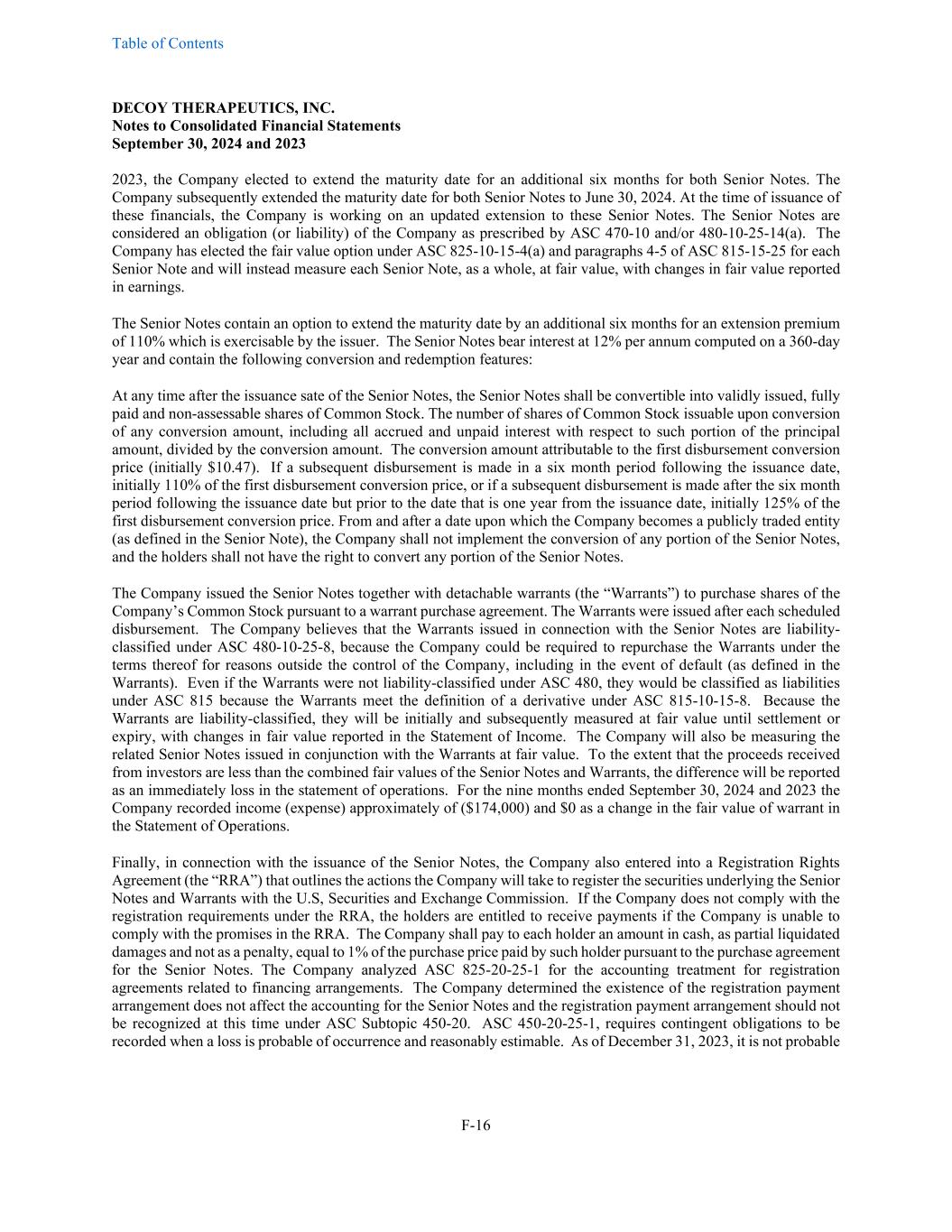 Table of Contents DECOY THERAPEUTICS, INC. Notes to Consolidated Financial Statements September 30, 2024 and 2023 F-16 2023, the Company elected to extend the maturity date for an additional six months for both Senior Notes. The Company subsequently extended the maturity date for both Senior Notes to June 30, 2024. At the time of issuance of these financials, the Company is working on an updated extension to these Senior Notes. The Senior Notes are considered an obligation (or liability) of the Company as prescribed by ASC 470-10 and/or 480-10-25-14(a). The Company has elected the fair value option under ASC 825-10-15-4(a) and paragraphs 4-5 of ASC 815-15-25 for each Senior Note and will instead measure each Senior Note, as a whole, at fair value, with changes in fair value reported in earnings. The Senior Notes contain an option to extend the maturity date by an additional six months for an extension premium of 110% which is exercisable by the issuer. The Senior Notes bear interest at 12% per annum computed on a 360-day year and contain the following conversion and redemption features: At any time after the issuance sate of the Senior Notes, the Senior Notes shall be convertible into validly issued, fully paid and non-assessable shares of Common Stock. The number of shares of Common Stock issuable upon conversion of any conversion amount, including all accrued and unpaid interest with respect to such portion of the principal amount, divided by the conversion amount. The conversion amount attributable to the first disbursement conversion price (initially $10.47). If a subsequent disbursement is made in a six month period following the issuance date, initially 110% of the first disbursement conversion price, or if a subsequent disbursement is made after the six month period following the issuance date but prior to the date that is one year from the issuance date, initially 125% of the first disbursement conversion price. From and after a date upon which the Company becomes a publicly traded entity (as defined in the Senior Note), the Company shall not implement the conversion of any portion of the Senior Notes, and the holders shall not have the right to convert any portion of the Senior Notes. The Company issued the Senior Notes together with detachable warrants (the “Warrants”) to purchase shares of the Company’s Common Stock pursuant to a warrant purchase agreement. The Warrants were issued after each scheduled disbursement. The Company believes that the Warrants issued in connection with the Senior Notes are liability- classified under ASC 480-10-25-8, because the Company could be required to repurchase the Warrants under the terms thereof for reasons outside the control of the Company, including in the event of default (as defined in the Warrants). Even if the Warrants were not liability-classified under ASC 480, they would be classified as liabilities under ASC 815 because the Warrants meet the definition of a derivative under ASC 815-10-15-8. Because the Warrants are liability-classified, they will be initially and subsequently measured at fair value until settlement or expiry, with changes in fair value reported in the Statement of Income. The Company will also be measuring the related Senior Notes issued in conjunction with the Warrants at fair value. To the extent that the proceeds received from investors are less than the combined fair values of the Senior Notes and Warrants, the difference will be reported as an immediately loss in the statement of operations. For the nine months ended September 30, 2024 and 2023 the Company recorded income (expense) approximately of ($174,000) and $0 as a change in the fair value of warrant in the Statement of Operations. Finally, in connection with the issuance of the Senior Notes, the Company also entered into a Registration Rights Agreement (the “RRA”) that outlines the actions the Company will take to register the securities underlying the Senior Notes and Warrants with the U.S, Securities and Exchange Commission. If the Company does not comply with the registration requirements under the RRA, the holders are entitled to receive payments if the Company is unable to comply with the promises in the RRA. The Company shall pay to each holder an amount in cash, as partial liquidated damages and not as a penalty, equal to 1% of the purchase price paid by such holder pursuant to the purchase agreement for the Senior Notes. The Company analyzed ASC 825-20-25-1 for the accounting treatment for registration agreements related to financing arrangements. The Company determined the existence of the registration payment arrangement does not affect the accounting for the Senior Notes and the registration payment arrangement should not be recognized at this time under ASC Subtopic 450-20. ASC 450-20-25-1, requires contingent obligations to be recorded when a loss is probable of occurrence and reasonably estimable. As of December 31, 2023, it is not probable
