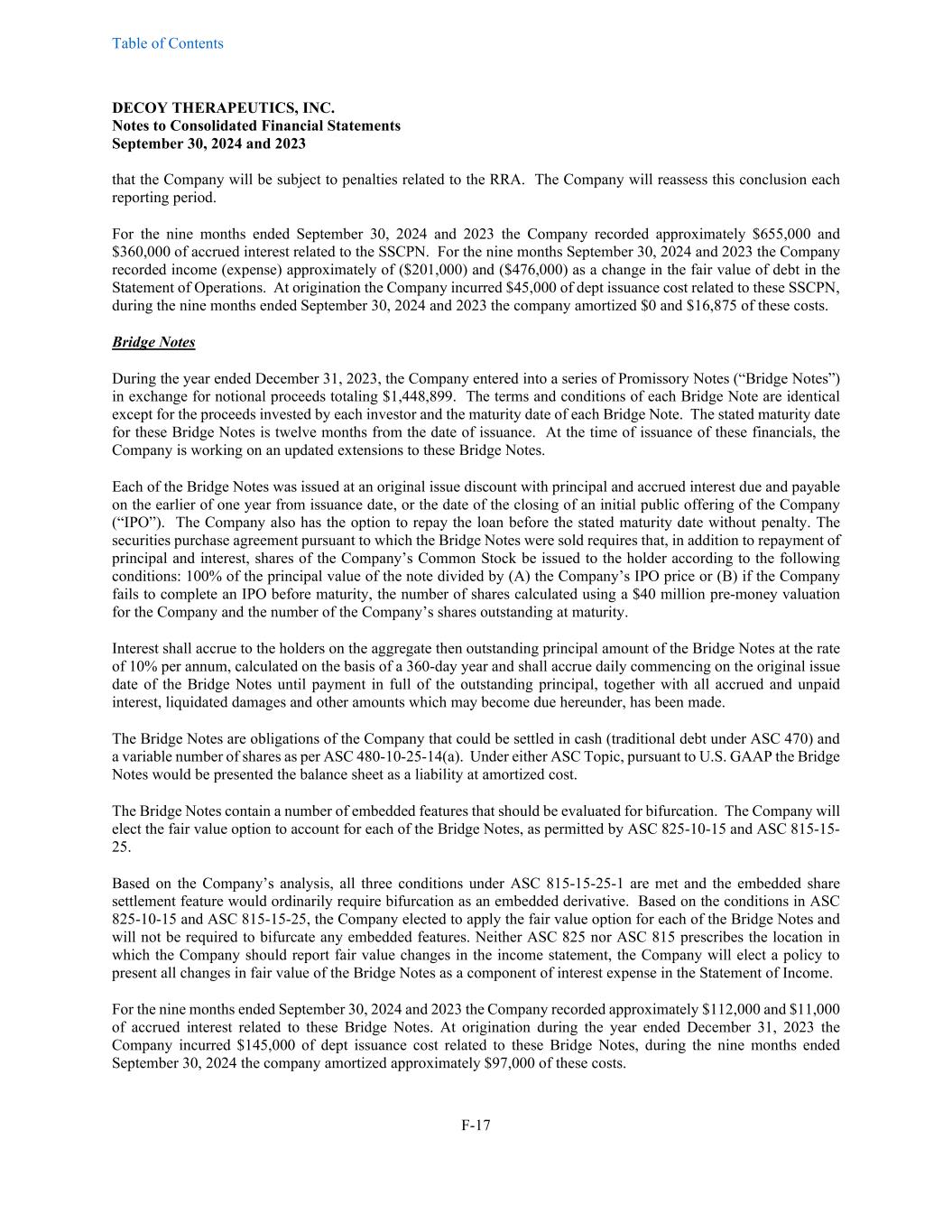 Table of Contents DECOY THERAPEUTICS, INC. Notes to Consolidated Financial Statements September 30, 2024 and 2023 F-17 that the Company will be subject to penalties related to the RRA. The Company will reassess this conclusion each reporting period. For the nine months ended September 30, 2024 and 2023 the Company recorded approximately $655,000 and $360,000 of accrued interest related to the SSCPN. For the nine months September 30, 2024 and 2023 the Company recorded income (expense) approximately of ($201,000) and ($476,000) as a change in the fair value of debt in the Statement of Operations. At origination the Company incurred $45,000 of dept issuance cost related to these SSCPN, during the nine months ended September 30, 2024 and 2023 the company amortized $0 and $16,875 of these costs. Bridge Notes During the year ended December 31, 2023, the Company entered into a series of Promissory Notes (“Bridge Notes”) in exchange for notional proceeds totaling $1,448,899. The terms and conditions of each Bridge Note are identical except for the proceeds invested by each investor and the maturity date of each Bridge Note. The stated maturity date for these Bridge Notes is twelve months from the date of issuance. At the time of issuance of these financials, the Company is working on an updated extensions to these Bridge Notes. Each of the Bridge Notes was issued at an original issue discount with principal and accrued interest due and payable on the earlier of one year from issuance date, or the date of the closing of an initial public offering of the Company (“IPO”). The Company also has the option to repay the loan before the stated maturity date without penalty. The securities purchase agreement pursuant to which the Bridge Notes were sold requires that, in addition to repayment of principal and interest, shares of the Company’s Common Stock be issued to the holder according to the following conditions: 100% of the principal value of the note divided by (A) the Company’s IPO price or (B) if the Company fails to complete an IPO before maturity, the number of shares calculated using a $40 million pre-money valuation for the Company and the number of the Company’s shares outstanding at maturity. Interest shall accrue to the holders on the aggregate then outstanding principal amount of the Bridge Notes at the rate of 10% per annum, calculated on the basis of a 360-day year and shall accrue daily commencing on the original issue date of the Bridge Notes until payment in full of the outstanding principal, together with all accrued and unpaid interest, liquidated damages and other amounts which may become due hereunder, has been made. The Bridge Notes are obligations of the Company that could be settled in cash (traditional debt under ASC 470) and a variable number of shares as per ASC 480-10-25-14(a). Under either ASC Topic, pursuant to U.S. GAAP the Bridge Notes would be presented the balance sheet as a liability at amortized cost. The Bridge Notes contain a number of embedded features that should be evaluated for bifurcation. The Company will elect the fair value option to account for each of the Bridge Notes, as permitted by ASC 825-10-15 and ASC 815-15- 25. Based on the Company’s analysis, all three conditions under ASC 815-15-25-1 are met and the embedded share settlement feature would ordinarily require bifurcation as an embedded derivative. Based on the conditions in ASC 825-10-15 and ASC 815-15-25, the Company elected to apply the fair value option for each of the Bridge Notes and will not be required to bifurcate any embedded features. Neither ASC 825 nor ASC 815 prescribes the location in which the Company should report fair value changes in the income statement, the Company will elect a policy to present all changes in fair value of the Bridge Notes as a component of interest expense in the Statement of Income. For the nine months ended September 30, 2024 and 2023 the Company recorded approximately $112,000 and $11,000 of accrued interest related to these Bridge Notes. At origination during the year ended December 31, 2023 the Company incurred $145,000 of dept issuance cost related to these Bridge Notes, during the nine months ended September 30, 2024 the company amortized approximately $97,000 of these costs.