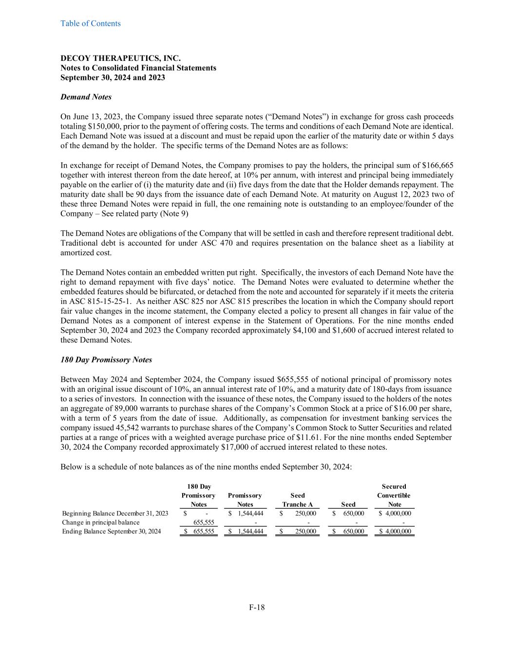 Table of Contents DECOY THERAPEUTICS, INC. Notes to Consolidated Financial Statements September 30, 2024 and 2023 F-18 Demand Notes On June 13, 2023, the Company issued three separate notes (“Demand Notes”) in exchange for gross cash proceeds totaling $150,000, prior to the payment of offering costs. The terms and conditions of each Demand Note are identical. Each Demand Note was issued at a discount and must be repaid upon the earlier of the maturity date or within 5 days of the demand by the holder. The specific terms of the Demand Notes are as follows: In exchange for receipt of Demand Notes, the Company promises to pay the holders, the principal sum of $166,665 together with interest thereon from the date hereof, at 10% per annum, with interest and principal being immediately payable on the earlier of (i) the maturity date and (ii) five days from the date that the Holder demands repayment. The maturity date shall be 90 days from the issuance date of each Demand Note. At maturity on August 12, 2023 two of these three Demand Notes were repaid in full, the one remaining note is outstanding to an employee/founder of the Company – See related party (Note 9) The Demand Notes are obligations of the Company that will be settled in cash and therefore represent traditional debt. Traditional debt is accounted for under ASC 470 and requires presentation on the balance sheet as a liability at amortized cost. The Demand Notes contain an embedded written put right. Specifically, the investors of each Demand Note have the right to demand repayment with five days’ notice. The Demand Notes were evaluated to determine whether the embedded features should be bifurcated, or detached from the note and accounted for separately if it meets the criteria in ASC 815-15-25-1. As neither ASC 825 nor ASC 815 prescribes the location in which the Company should report fair value changes in the income statement, the Company elected a policy to present all changes in fair value of the Demand Notes as a component of interest expense in the Statement of Operations. For the nine months ended September 30, 2024 and 2023 the Company recorded approximately $4,100 and $1,600 of accrued interest related to these Demand Notes. 180 Day Promissory Notes Between May 2024 and September 2024, the Company issued $655,555 of notional principal of promissory notes with an original issue discount of 10%, an annual interest rate of 10%, and a maturity date of 180-days from issuance to a series of investors. In connection with the issuance of these notes, the Company issued to the holders of the notes an aggregate of 89,000 warrants to purchase shares of the Company’s Common Stock at a price of $16.00 per share, with a term of 5 years from the date of issue. Additionally, as compensation for investment banking services the company issued 45,542 warrants to purchase shares of the Company’s Common Stock to Sutter Securities and related parties at a range of prices with a weighted average purchase price of $11.61. For the nine months ended September 30, 2024 the Company recorded approximately $17,000 of accrued interest related to these notes. Below is a schedule of note balances as of the nine months ended September 30, 2024: 180 Day Secured Promissory Promissory Seed Convertible Notes Notes Tranche A Seed Note Beginning Balance December 31, 2023 -$ 1,544,444$ 250,000$ 650,000$ 4,000,000$ Change in principal balance 655,555 - - - - Ending Balance September 30, 2024 655,555$ 1,544,444$ 250,000$ 650,000$ 4,000,000$