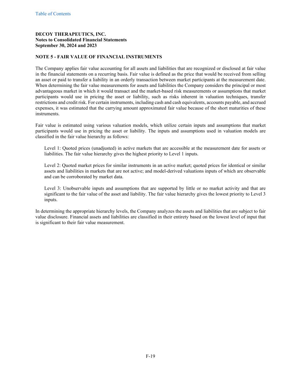 Table of Contents DECOY THERAPEUTICS, INC. Notes to Consolidated Financial Statements September 30, 2024 and 2023 F-19 NOTE 5 - FAIR VALUE OF FINANCIAL INSTRUMENTS The Company applies fair value accounting for all assets and liabilities that are recognized or disclosed at fair value in the financial statements on a recurring basis. Fair value is defined as the price that would be received from selling an asset or paid to transfer a liability in an orderly transaction between market participants at the measurement date. When determining the fair value measurements for assets and liabilities the Company considers the principal or most advantageous market in which it would transact and the market-based risk measurements or assumptions that market participants would use in pricing the asset or liability, such as risks inherent in valuation techniques, transfer restrictions and credit risk. For certain instruments, including cash and cash equivalents, accounts payable, and accrued expenses, it was estimated that the carrying amount approximated fair value because of the short maturities of these instruments. Fair value is estimated using various valuation models, which utilize certain inputs and assumptions that market participants would use in pricing the asset or liability. The inputs and assumptions used in valuation models are classified in the fair value hierarchy as follows: Level 1: Quoted prices (unadjusted) in active markets that are accessible at the measurement date for assets or liabilities. The fair value hierarchy gives the highest priority to Level 1 inputs. Level 2: Quoted market prices for similar instruments in an active market; quoted prices for identical or similar assets and liabilities in markets that are not active; and model-derived valuations inputs of which are observable and can be corroborated by market data. Level 3: Unobservable inputs and assumptions that are supported by little or no market activity and that are significant to the fair value of the asset and liability. The fair value hierarchy gives the lowest priority to Level 3 inputs. In determining the appropriate hierarchy levels, the Company analyzes the assets and liabilities that are subject to fair value disclosure. Financial assets and liabilities are classified in their entirety based on the lowest level of input that is significant to their fair value measurement.