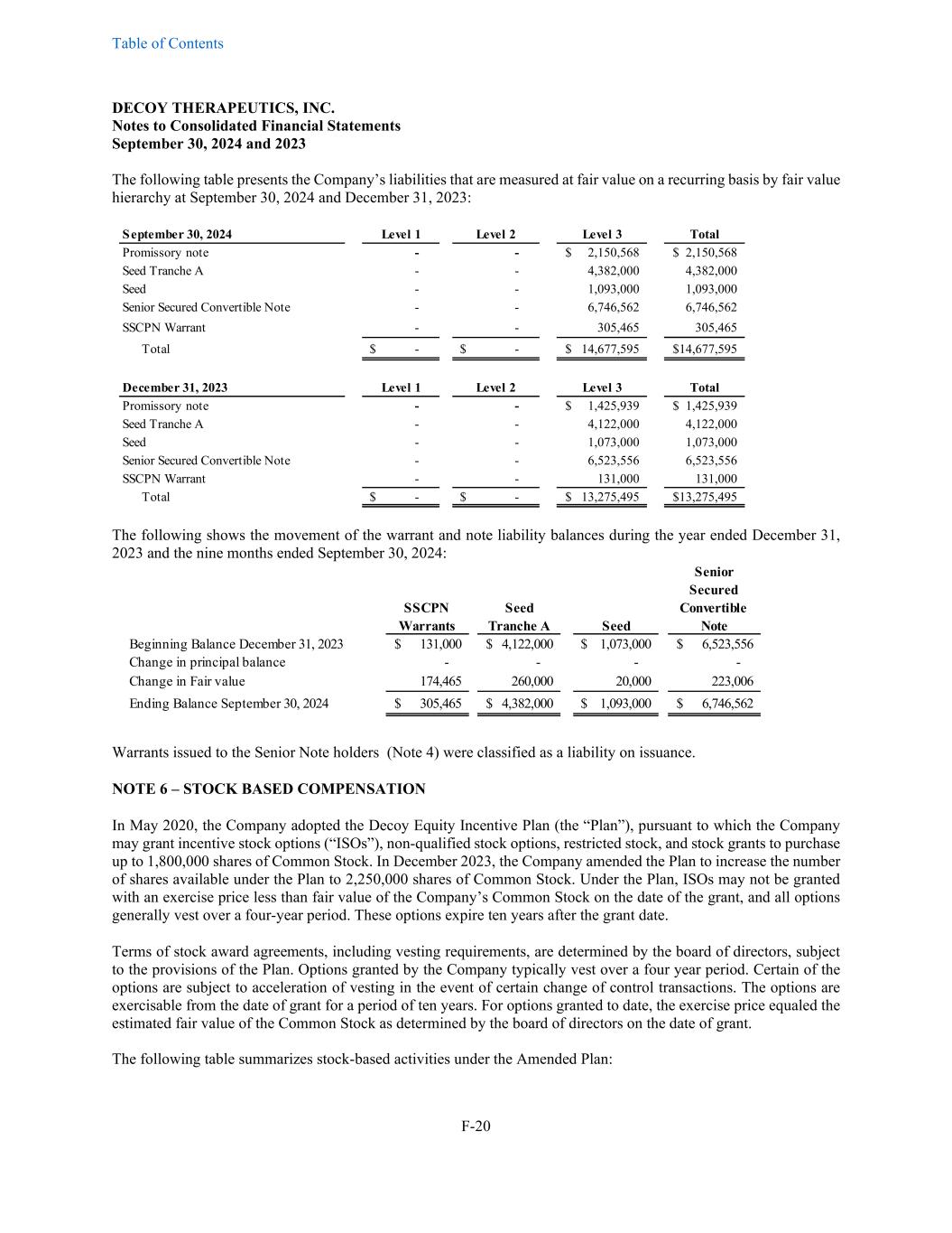 Table of Contents DECOY THERAPEUTICS, INC. Notes to Consolidated Financial Statements September 30, 2024 and 2023 F-20 The following table presents the Company’s liabilities that are measured at fair value on a recurring basis by fair value hierarchy at September 30, 2024 and December 31, 2023: September 30, 2024 Level 1 Level 2 Level 3 Total Promissory note - - 2,150,568$ 2,150,568$ Seed Tranche A - - 4,382,000 4,382,000 Seed - - 1,093,000 1,093,000 Senior Secured Convertible Note - - 6,746,562 6,746,562 SSCPN Warrant - - 305,465 305,465 Total -$ -$ 14,677,595$ 14,677,595$ December 31, 2023 Level 1 Level 2 Level 3 Total Promissory note - - 1,425,939$ 1,425,939$ Seed Tranche A - - 4,122,000 4,122,000 Seed - - 1,073,000 1,073,000 Senior Secured Convertible Note - - 6,523,556 6,523,556 SSCPN Warrant - - 131,000 131,000 Total -$ -$ 13,275,495$ 13,275,495$ The following shows the movement of the warrant and note liability balances during the year ended December 31, 2023 and the nine months ended September 30, 2024: Senior Secured SSCPN Seed Convertible Warrants Tranche A Seed Note Beginning Balance December 31, 2023 131,000$ 4,122,000$ 1,073,000$ 6,523,556$ Change in principal balance - - - - Change in Fair value 174,465 260,000 20,000 223,006 Ending Balance September 30, 2024 305,465$ 4,382,000$ 1,093,000$ 6,746,562$ Warrants issued to the Senior Note holders (Note 4) were classified as a liability on issuance. NOTE 6 – STOCK BASED COMPENSATION In May 2020, the Company adopted the Decoy Equity Incentive Plan (the “Plan”), pursuant to which the Company may grant incentive stock options (“ISOs”), non-qualified stock options, restricted stock, and stock grants to purchase up to 1,800,000 shares of Common Stock. In December 2023, the Company amended the Plan to increase the number of shares available under the Plan to 2,250,000 shares of Common Stock. Under the Plan, ISOs may not be granted with an exercise price less than fair value of the Company’s Common Stock on the date of the grant, and all options generally vest over a four-year period. These options expire ten years after the grant date. Terms of stock award agreements, including vesting requirements, are determined by the board of directors, subject to the provisions of the Plan. Options granted by the Company typically vest over a four year period. Certain of the options are subject to acceleration of vesting in the event of certain change of control transactions. The options are exercisable from the date of grant for a period of ten years. For options granted to date, the exercise price equaled the estimated fair value of the Common Stock as determined by the board of directors on the date of grant. The following table summarizes stock-based activities under the Amended Plan: