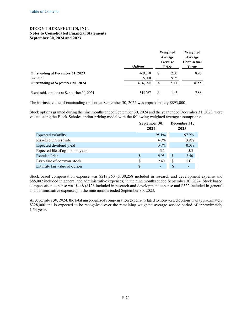 Table of Contents DECOY THERAPEUTICS, INC. Notes to Consolidated Financial Statements September 30, 2024 and 2023 F-21 Options Weighted Average Exercise Price Weighted Average Contractual Terms Outstanding at December 31, 2023 469,350 2.03$ 8.96 Granted 5,000 9.95 Outstanding at September 30, 2024 474,350 2.11$ 8.22 Exercisable options at September 30, 2024 345,267 1.43$ 7.88 The intrinsic value of outstanding options at September 30, 2024 was approximately $893,000. Stock options granted during the nine months ended September 30, 2024 and the year ended December 31, 2023, were valued using the Black-Scholes option-pricing model with the following weighted average assumptions: September 30, 2024 December 31, 2023 Expected volatility 95.1% 97.9% Risk-free interest rate 4.6% 3.9% Expected dividend yield 0.0% 0.0% Expected life of options in years 5.2 5.5 Exercise Price 9.95$ 3.56$ Fair value of common stock 2.40$ 2.61$ Estimate fair value of option -$ -$ Stock based compensation expense was $218,260 ($130,258 included in research and development expense and $88,002 included in general and administrative expenses) in the nine months ended September 30, 2024. Stock based compensation expense was $448 ($126 included in research and development expense and $322 included in general and administrative expenses) in the nine months ended September 30, 2023. At September 30, 2024, the total unrecognized compensation expense related to non-vested options was approximately $328,000 and is expected to be recognized over the remaining weighted average service period of approximately 1.54 years.