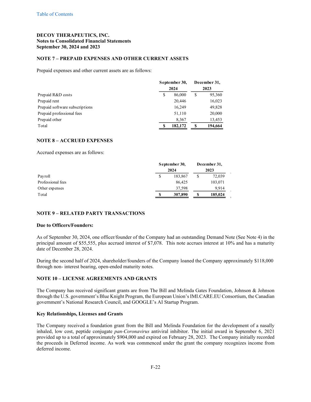 Table of Contents DECOY THERAPEUTICS, INC. Notes to Consolidated Financial Statements September 30, 2024 and 2023 F-22 NOTE 7 – PREPAID EXPENSES AND OTHER CURRENT ASSETS Prepaid expenses and other current assets are as follows: September 30, December 31, 2024 2023 Prepaid R&D costs $ 86,000 $ 95,360 Prepaid rent 20,446 16,023 Prepaid software subscriptions 16,249 49,828 Prepaid professional fees 51,110 20,000 Prepaid other 8,367 13,453 Total $ 182,172 $ 194,664 NOTE 8 – ACCRUED EXPENSES Accrued expenses are as follows: September 30, December 31, 2024 2023 Payroll $ 183,867 $ 72,039 Professional fees 86,425 103,071 Other expenses 37,598 9,914 Total $ 307,890 $ 185,024 NOTE 9 – RELATED PARTY TRANSACTIONS Due to Officers/Founders: As of September 30, 2024, one officer/founder of the Company had an outstanding Demand Note (See Note 4) in the principal amount of $55,555, plus accrued interest of $7,078. This note accrues interest at 10% and has a maturity date of December 28, 2024. During the second half of 2024, shareholder/founders of the Company loaned the Company approximately $118,000 through non- interest bearing, open-ended maturity notes. NOTE 10 – LICENSE AGREEMENTS AND GRANTS The Company has received significant grants are from The Bill and Melinda Gates Foundation, Johnson & Johnson through the U.S. government’s Blue Knight Program, the European Union’s IMI.CARE.EU Consortium, the Canadian government’s National Research Council, and GOOGLE’s AI Startup Program. Key Relationships, Licenses and Grants The Company received a foundation grant from the Bill and Melinda Foundation for the development of a nasally inhaled, low cost, peptide conjugate pan-Coronavirus antiviral inhibitor. The initial award in September 6, 2021 provided up to a total of approximately $904,000 and expired on February 28, 2023. The Company initially recorded the proceeds in Deferred income. As work was commenced under the grant the company recognizes income from deferred income.