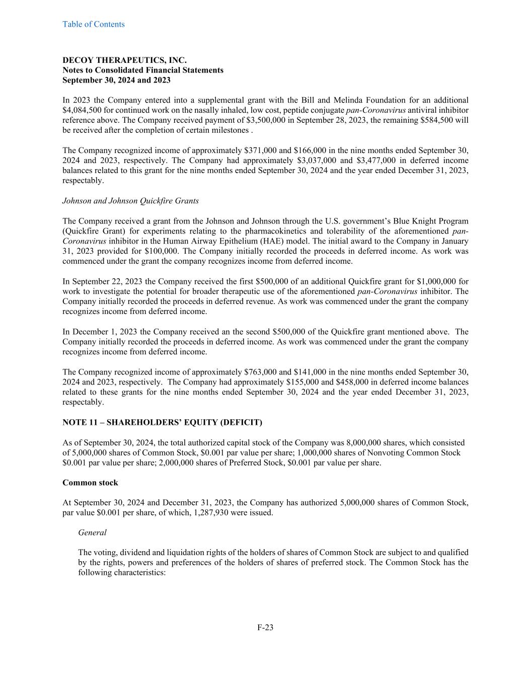 Table of Contents DECOY THERAPEUTICS, INC. Notes to Consolidated Financial Statements September 30, 2024 and 2023 F-23 In 2023 the Company entered into a supplemental grant with the Bill and Melinda Foundation for an additional $4,084,500 for continued work on the nasally inhaled, low cost, peptide conjugate pan-Coronavirus antiviral inhibitor reference above. The Company received payment of $3,500,000 in September 28, 2023, the remaining $584,500 will be received after the completion of certain milestones . The Company recognized income of approximately $371,000 and $166,000 in the nine months ended September 30, 2024 and 2023, respectively. The Company had approximately $3,037,000 and $3,477,000 in deferred income balances related to this grant for the nine months ended September 30, 2024 and the year ended December 31, 2023, respectably. Johnson and Johnson Quickfire Grants The Company received a grant from the Johnson and Johnson through the U.S. government’s Blue Knight Program (Quickfire Grant) for experiments relating to the pharmacokinetics and tolerability of the aforementioned pan- Coronavirus inhibitor in the Human Airway Epithelium (HAE) model. The initial award to the Company in January 31, 2023 provided for $100,000. The Company initially recorded the proceeds in deferred income. As work was commenced under the grant the company recognizes income from deferred income. In September 22, 2023 the Company received the first $500,000 of an additional Quickfire grant for $1,000,000 for work to investigate the potential for broader therapeutic use of the aforementioned pan-Coronavirus inhibitor. The Company initially recorded the proceeds in deferred revenue. As work was commenced under the grant the company recognizes income from deferred income. In December 1, 2023 the Company received an the second $500,000 of the Quickfire grant mentioned above. The Company initially recorded the proceeds in deferred income. As work was commenced under the grant the company recognizes income from deferred income. The Company recognized income of approximately $763,000 and $141,000 in the nine months ended September 30, 2024 and 2023, respectively. The Company had approximately $155,000 and $458,000 in deferred income balances related to these grants for the nine months ended September 30, 2024 and the year ended December 31, 2023, respectably. NOTE 11 – SHAREHOLDERS’ EQUITY (DEFICIT) As of September 30, 2024, the total authorized capital stock of the Company was 8,000,000 shares, which consisted of 5,000,000 shares of Common Stock, $0.001 par value per share; 1,000,000 shares of Nonvoting Common Stock $0.001 par value per share; 2,000,000 shares of Preferred Stock, $0.001 par value per share. Common stock At September 30, 2024 and December 31, 2023, the Company has authorized 5,000,000 shares of Common Stock, par value $0.001 per share, of which, 1,287,930 were issued. General The voting, dividend and liquidation rights of the holders of shares of Common Stock are subject to and qualified by the rights, powers and preferences of the holders of shares of preferred stock. The Common Stock has the following characteristics: