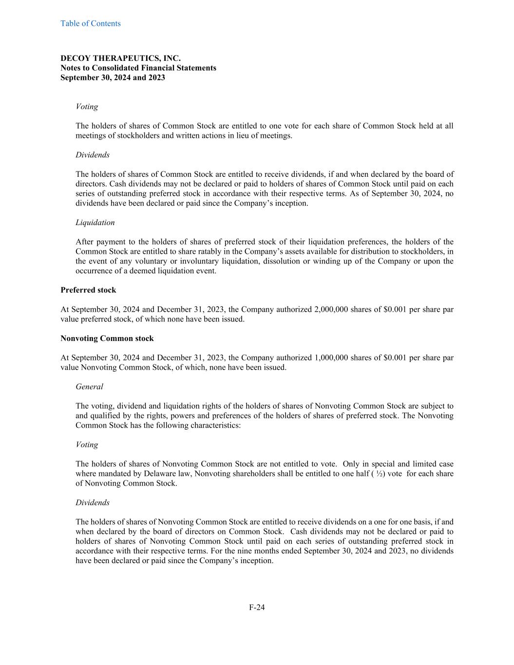 Table of Contents DECOY THERAPEUTICS, INC. Notes to Consolidated Financial Statements September 30, 2024 and 2023 F-24 Voting The holders of shares of Common Stock are entitled to one vote for each share of Common Stock held at all meetings of stockholders and written actions in lieu of meetings. Dividends The holders of shares of Common Stock are entitled to receive dividends, if and when declared by the board of directors. Cash dividends may not be declared or paid to holders of shares of Common Stock until paid on each series of outstanding preferred stock in accordance with their respective terms. As of September 30, 2024, no dividends have been declared or paid since the Company’s inception. Liquidation After payment to the holders of shares of preferred stock of their liquidation preferences, the holders of the Common Stock are entitled to share ratably in the Company’s assets available for distribution to stockholders, in the event of any voluntary or involuntary liquidation, dissolution or winding up of the Company or upon the occurrence of a deemed liquidation event. Preferred stock At September 30, 2024 and December 31, 2023, the Company authorized 2,000,000 shares of $0.001 per share par value preferred stock, of which none have been issued. Nonvoting Common stock At September 30, 2024 and December 31, 2023, the Company authorized 1,000,000 shares of $0.001 per share par value Nonvoting Common Stock, of which, none have been issued. General The voting, dividend and liquidation rights of the holders of shares of Nonvoting Common Stock are subject to and qualified by the rights, powers and preferences of the holders of shares of preferred stock. The Nonvoting Common Stock has the following characteristics: Voting The holders of shares of Nonvoting Common Stock are not entitled to vote. Only in special and limited case where mandated by Delaware law, Nonvoting shareholders shall be entitled to one half ( ½) vote for each share of Nonvoting Common Stock. Dividends The holders of shares of Nonvoting Common Stock are entitled to receive dividends on a one for one basis, if and when declared by the board of directors on Common Stock. Cash dividends may not be declared or paid to holders of shares of Nonvoting Common Stock until paid on each series of outstanding preferred stock in accordance with their respective terms. For the nine months ended September 30, 2024 and 2023, no dividends have been declared or paid since the Company’s inception.