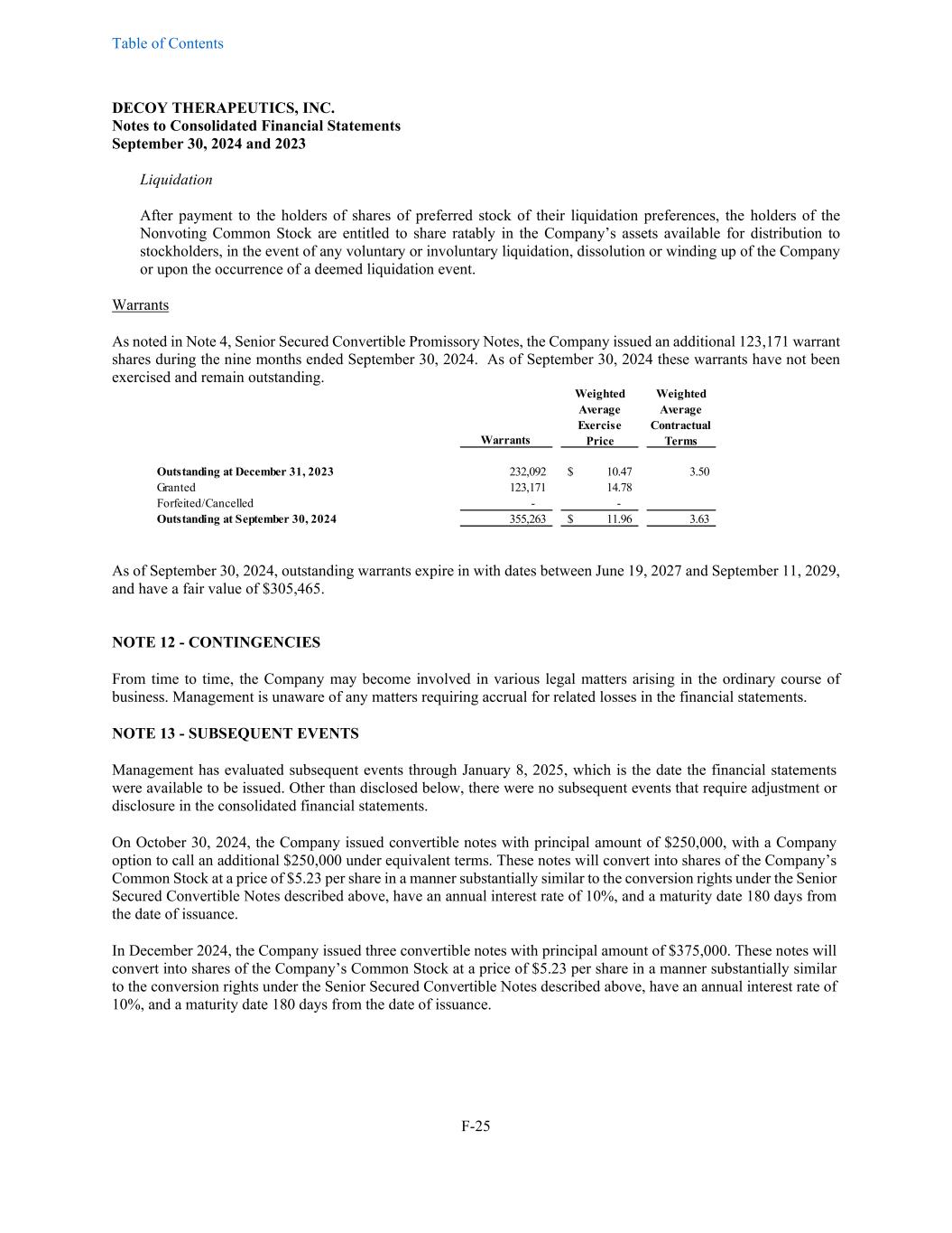 Table of Contents DECOY THERAPEUTICS, INC. Notes to Consolidated Financial Statements September 30, 2024 and 2023 F-25 Liquidation After payment to the holders of shares of preferred stock of their liquidation preferences, the holders of the Nonvoting Common Stock are entitled to share ratably in the Company’s assets available for distribution to stockholders, in the event of any voluntary or involuntary liquidation, dissolution or winding up of the Company or upon the occurrence of a deemed liquidation event. Warrants As noted in Note 4, Senior Secured Convertible Promissory Notes, the Company issued an additional 123,171 warrant shares during the nine months ended September 30, 2024. As of September 30, 2024 these warrants have not been exercised and remain outstanding. Warrants Weighted Average Exercise Price Weighted Average Contractual Terms Outstanding at December 31, 2023 232,092 10.47$ 3.50 Granted 123,171 14.78 Forfeited/Cancelled - - Outstanding at September 30, 2024 355,263 11.96$ 3.63 As of September 30, 2024, outstanding warrants expire in with dates between June 19, 2027 and September 11, 2029, and have a fair value of $305,465. NOTE 12 - CONTINGENCIES From time to time, the Company may become involved in various legal matters arising in the ordinary course of business. Management is unaware of any matters requiring accrual for related losses in the financial statements. NOTE 13 - SUBSEQUENT EVENTS Management has evaluated subsequent events through January 8, 2025, which is the date the financial statements were available to be issued. Other than disclosed below, there were no subsequent events that require adjustment or disclosure in the consolidated financial statements. On October 30, 2024, the Company issued convertible notes with principal amount of $250,000, with a Company option to call an additional $250,000 under equivalent terms. These notes will convert into shares of the Company’s Common Stock at a price of $5.23 per share in a manner substantially similar to the conversion rights under the Senior Secured Convertible Notes described above, have an annual interest rate of 10%, and a maturity date 180 days from the date of issuance. In December 2024, the Company issued three convertible notes with principal amount of $375,000. These notes will convert into shares of the Company’s Common Stock at a price of $5.23 per share in a manner substantially similar to the conversion rights under the Senior Secured Convertible Notes described above, have an annual interest rate of 10%, and a maturity date 180 days from the date of issuance.
