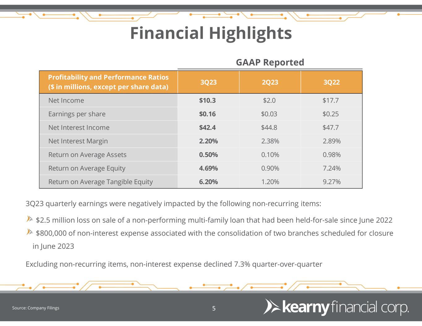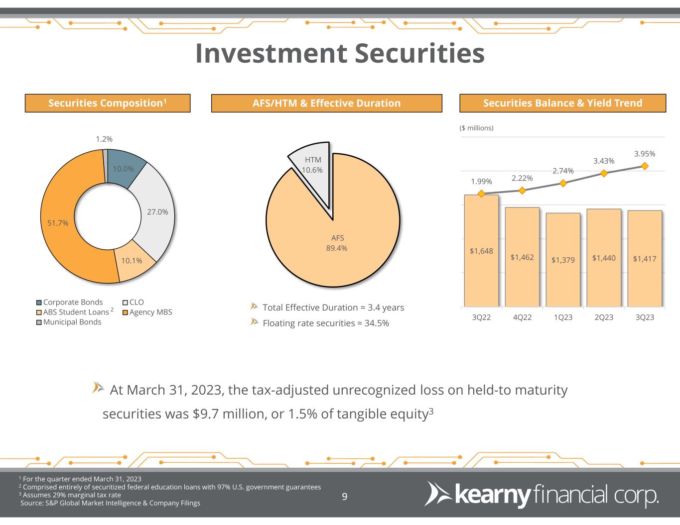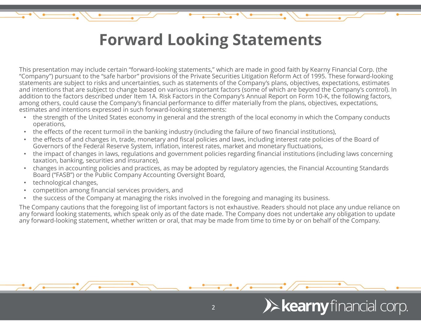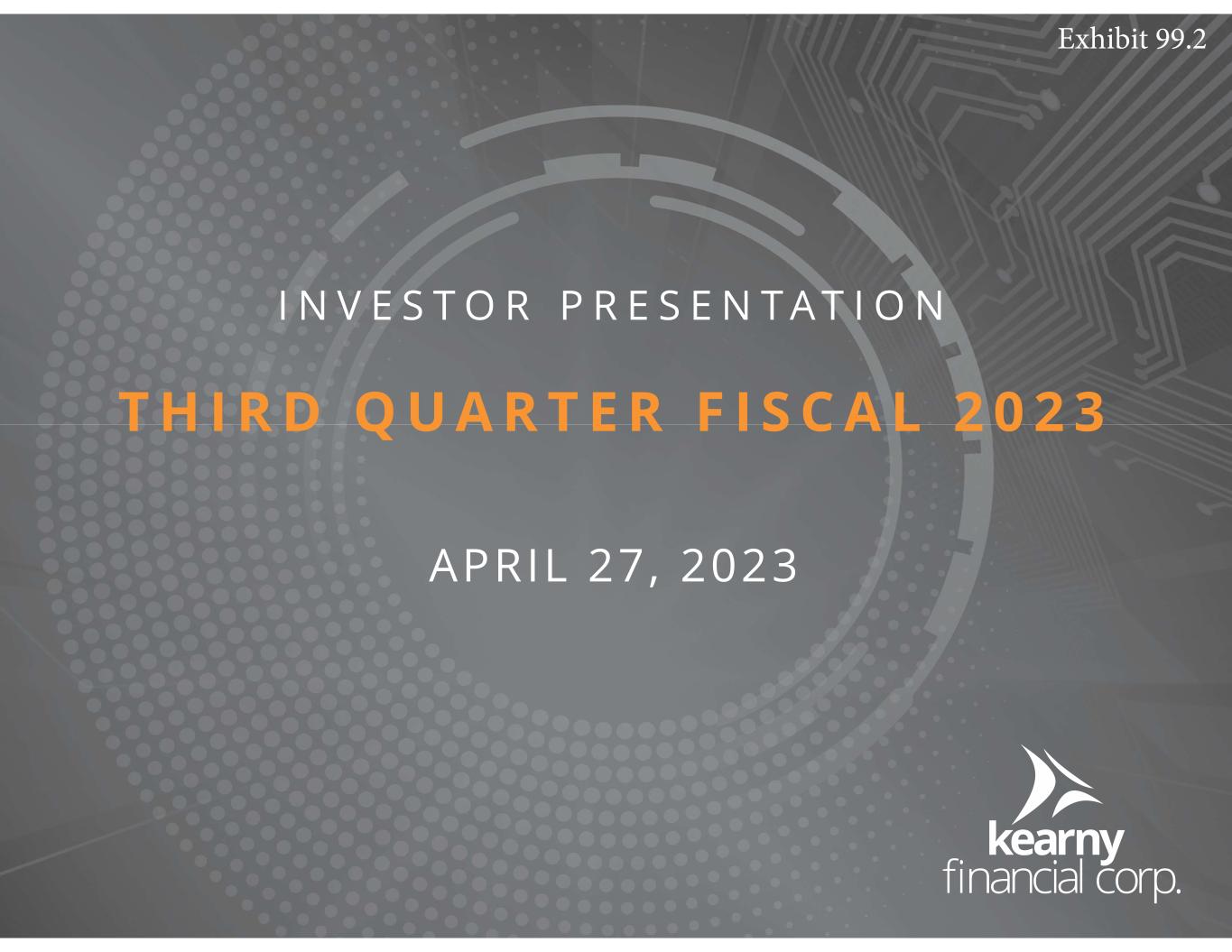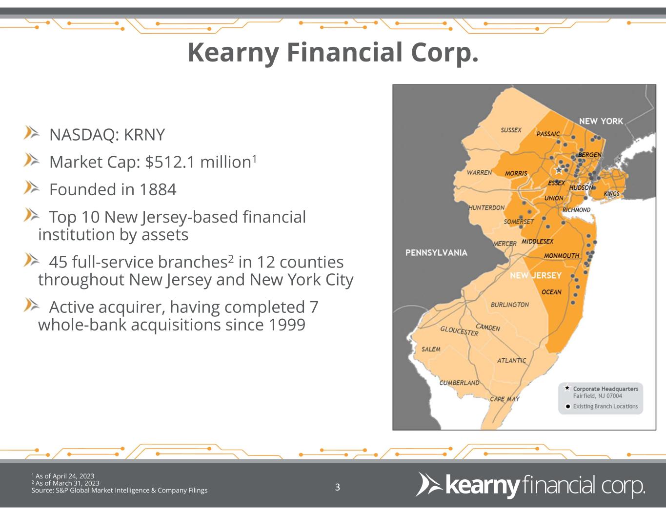 Forward Looking Statements 2 This presentation may include certain “forward-looking statements,” which are made in good faith by Kearny Financial Corp. (the “Company”) pursuant to the “safe harbor” provisions of the Private Securities Litigation Reform Act of 1995. These forward-looking statements are subject to risks and uncertainties, such as statements of the Company’s plans, objectives, expectations, estimates and intentions that are subject to change based on various important factors (some of which are beyond the Company’s control). In addition to the factors described under Item 1A. Risk Factors in the Company’s Annual Report on Form 10-K, the following factors, among others, could cause the Company’s financial performance to differ materially from the plans, objectives, expectations, estimates and intentions expressed in such forward-looking statements: • the strength of the United States economy in general and the strength of the local economy in which the Company conducts operations, • the effects of the recent turmoil in the banking industry (including the failure of two financial institutions), • the effects of and changes in, trade, monetary and fiscal policies and laws, including interest rate policies of the Board of Governors of the Federal Reserve System, inflation, interest rates, market and monetary fluctuations, • the impact of changes in laws, regulations and government policies regarding financial institutions (including laws concerning taxation, banking, securities and insurance), • changes in accounting policies and practices, as may be adopted by regulatory agencies, the Financial Accounting Standards Board (“FASB”) or the Public Company Accounting Oversight Board, • technological changes, • competition among financial services providers, and • the success of the Company at managing the risks involved in the foregoing and managing its business. The Company cautions that the foregoing list of important factors is not exhaustive. Readers should not place any undue reliance on any forward looking statements, which speak only as of the date made. The Company does not undertake any obligation to update any forward-looking statement, whether written or oral, that may be made from time to time by or on behalf of the Company.