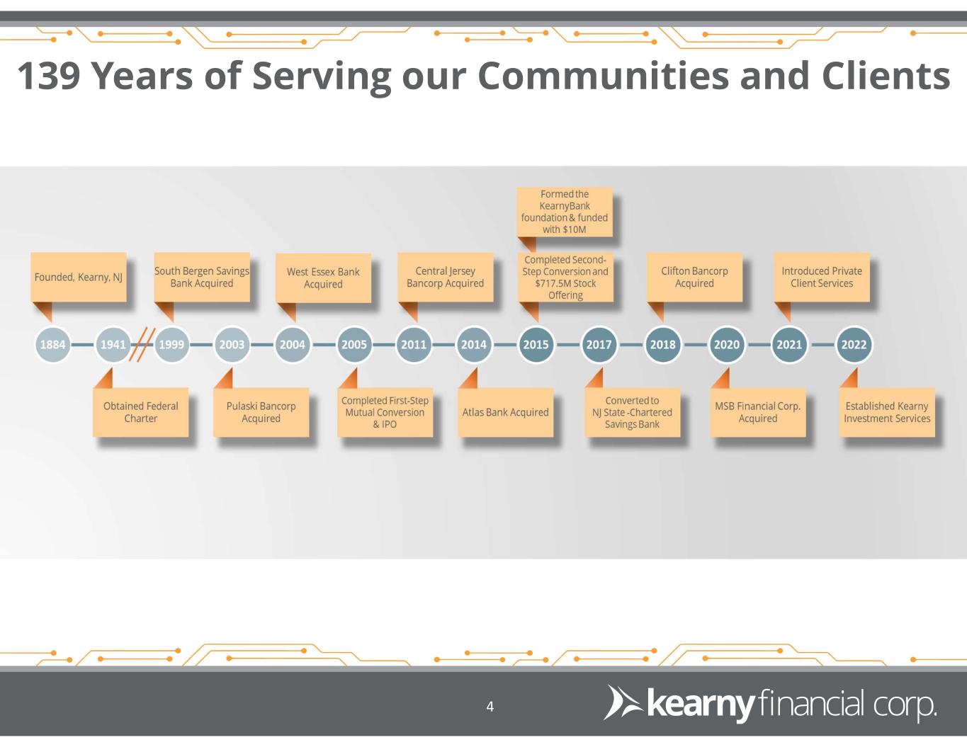Kearny Financial Corp. NASDAQ: KRNY Market Cap: $512.1 million1 Founded in 1884 Top 10 New Jersey-based financial institution by assets 45 full-service branches2 in 12 counties throughout New Jersey and New York City Active acquirer, having completed 7 whole-bank acquisitions since 1999 1 As of April 24, 2023 2 As of March 31, 2023 Source: S&P Global Market Intelligence & Company Filings 3