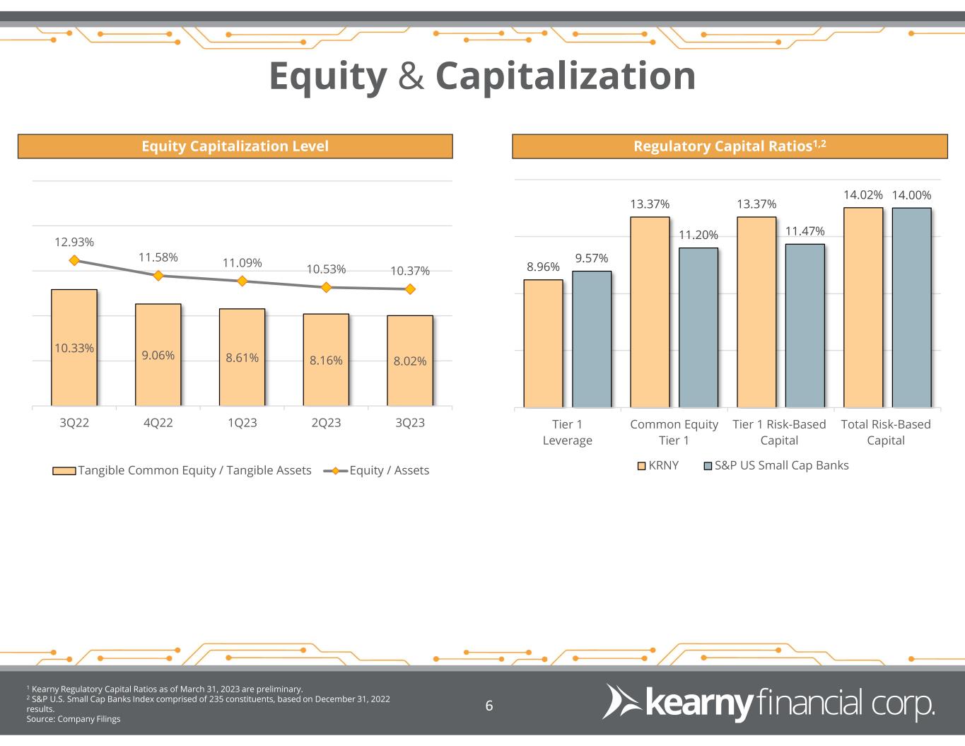 Financial Highlights Source: Company Filings 5 3Q23 quarterly earnings were negatively impacted by the following non-recurring items: $2.5 million loss on sale of a non-performing multi-family loan that had been held-for-sale since June 2022 $800,000 of non-interest expense associated with the consolidation of two branches scheduled for closure in June 2023 Excluding non-recurring items, non-interest expense declined 7.3% quarter-over-quarter Profitability and Performance Ratios ($ in millions, except per share data) 3Q23 2Q23 3Q22 Net Income $10.3 $2.0 $17.7 Earnings per share $0.16 $0.03 $0.25 Net Interest Income $42.4 $44.8 $47.7 Net Interest Margin 2.20% 2.38% 2.89% Return on Average Assets 0.50% 0.10% 0.98% Return on Average Equity 4.69% 0.90% 7.24% Return on Average Tangible Equity 6.20% 1.20% 9.27% GAAP Reported
