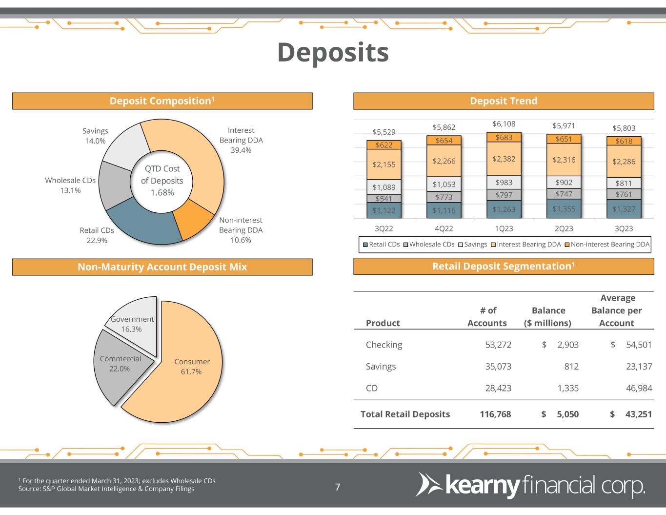 Equity & Capitalization Equity Capitalization Level 1 Kearny Regulatory Capital Ratios as of March 31, 2023 are preliminary. 2 S&P U.S. Small Cap Banks Index comprised of 235 constituents, based on December 31, 2022 results. Source: Company Filings 6 10.33% 9.06% 8.61% 8.16% 8.02% 12.93% 11.58% 11.09% 10.53% 10.37% 3Q22 4Q22 1Q23 2Q23 3Q23 Tangible Common Equity / Tangible Assets Equity / Assets 8.96% 13.37% 13.37% 14.02% 9.57% 11.20% 11.47% 14.00% Tier 1 Leverage Common Equity Tier 1 Tier 1 Risk-Based Capital Total Risk-Based Capital KRNY S&P US Small Cap Banks Regulatory Capital Ratios1,2