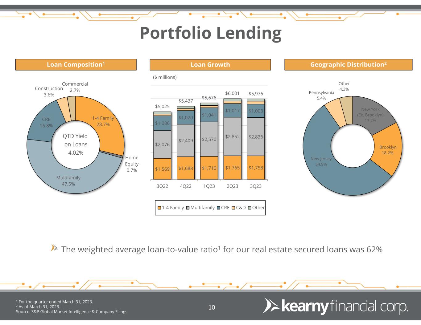 Investment Securities 1 For the quarter ended March 31, 2023 2 Comprised entirely of securitized federal education loans with 97% U.S. government guarantees 3 Assumes 29% marginal tax rate Source: S&P Global Market Intelligence & Company Filings 9 10.0% 27.0% 10.1% 51.7% 1.2% Corporate Bonds CLO ABS Student Loans Agency MBS Municipal Bonds 2 Securities Composition1 Securities Balance & Yield TrendAFS/HTM & Effective Duration At March 31, 2023, the tax-adjusted unrecognized loss on held-to maturity securities was $9.7 million, or 1.5% of tangible equity3 AFS 89.4% HTM 10.6% Total Effective Duration ≈ 3.4 years Floating rate securities ≈ 34.5% $1,648 $1,462 $1,379 $1,440 $1,417 1.99% 2.22% 2.74% 3.43% 3.95% 3Q22 4Q22 1Q23 2Q23 3Q23 ($ millions)