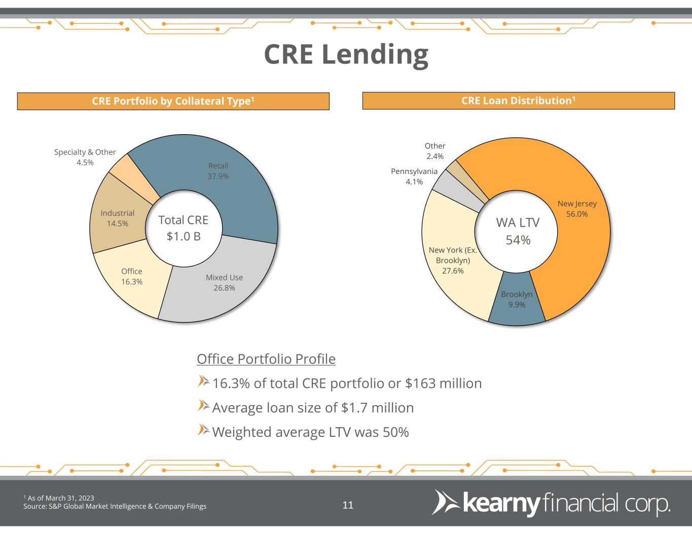 Portfolio Lending Loan Composition1 Geographic Distribution2Loan Growth The weighted average loan-to-value ratio1 for our real estate secured loans was 62% 1 For the quarter ended March 31, 2023. 2 As of March 31, 2023. Source: S&P Global Market Intelligence & Company Filings 10 New York (Ex. Brooklyn) 17.2% Brooklyn 18.2% New Jersey 54.9% Pennsylvania 5.4% Other 4.3% $1,569 $1,688 $1,710 $1,765 $1,758 $2,076 $2,409 $2,570 $2,852 $2,836 $1,086 $1,020 $1,041 $1,017 $1,003 $5,025 $5,437 $5,676 $6,001 $5,976 3Q22 4Q22 1Q23 2Q23 3Q23 1-4 Family Multifamily CRE C&D Other ($ millions) 1-4 Family 28.7% Home Equity 0.7% Multifamily 47.5% CRE 16.8% Construction 3.6% Commercial 2.7% QTD Yield on Loans 4.02%