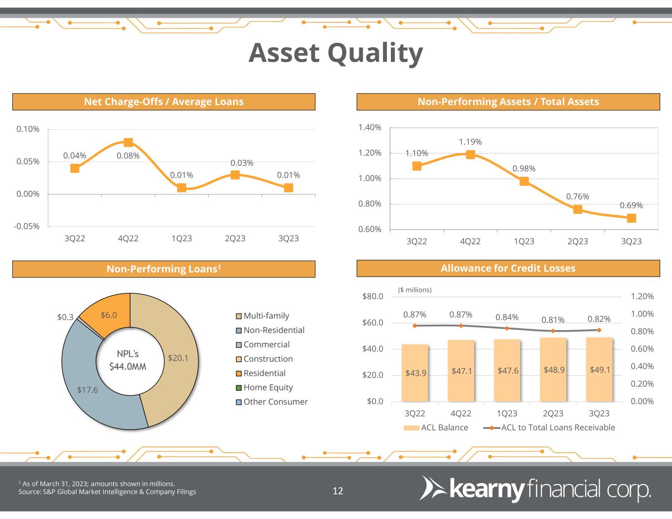Asset Quality Net Charge-Offs / Average Loans Non-Performing Assets / Total Assets Non-Performing Loans1 Allowance for Credit Losses 1 As of March 31, 2023; amounts shown in millions. Source: S&P Global Market Intelligence & Company Filings 1.10% 1.19% 0.98% 0.76% 0.69% 0.60% 0.80% 1.00% 1.20% 1.40% 3Q22 4Q22 1Q23 2Q23 3Q23 $43.9 $47.1 $47.6 $48.9 $49.1 0.87% 0.87% 0.84% 0.81% 0.82% 0.00% 0.20% 0.40% 0.60% 0.80% 1.00% 1.20% $0.0 $20.0 $40.0 $60.0 $80.0 3Q22 4Q22 1Q23 2Q23 3Q23 ACL Balance ACL to Total Loans Receivable ($ millions) 12 NPL's $44.0MM $20.1 $17.6 $0.3 $6.0 Multi-family Non-Residential Commercial Construction Residential Home Equity Other Consumer 0.04% 0.08% 0.01% 0.03% 0.01% -0.05% 0.00% 0.05% 0.10% 3Q22 4Q22 1Q23 2Q23 3Q23