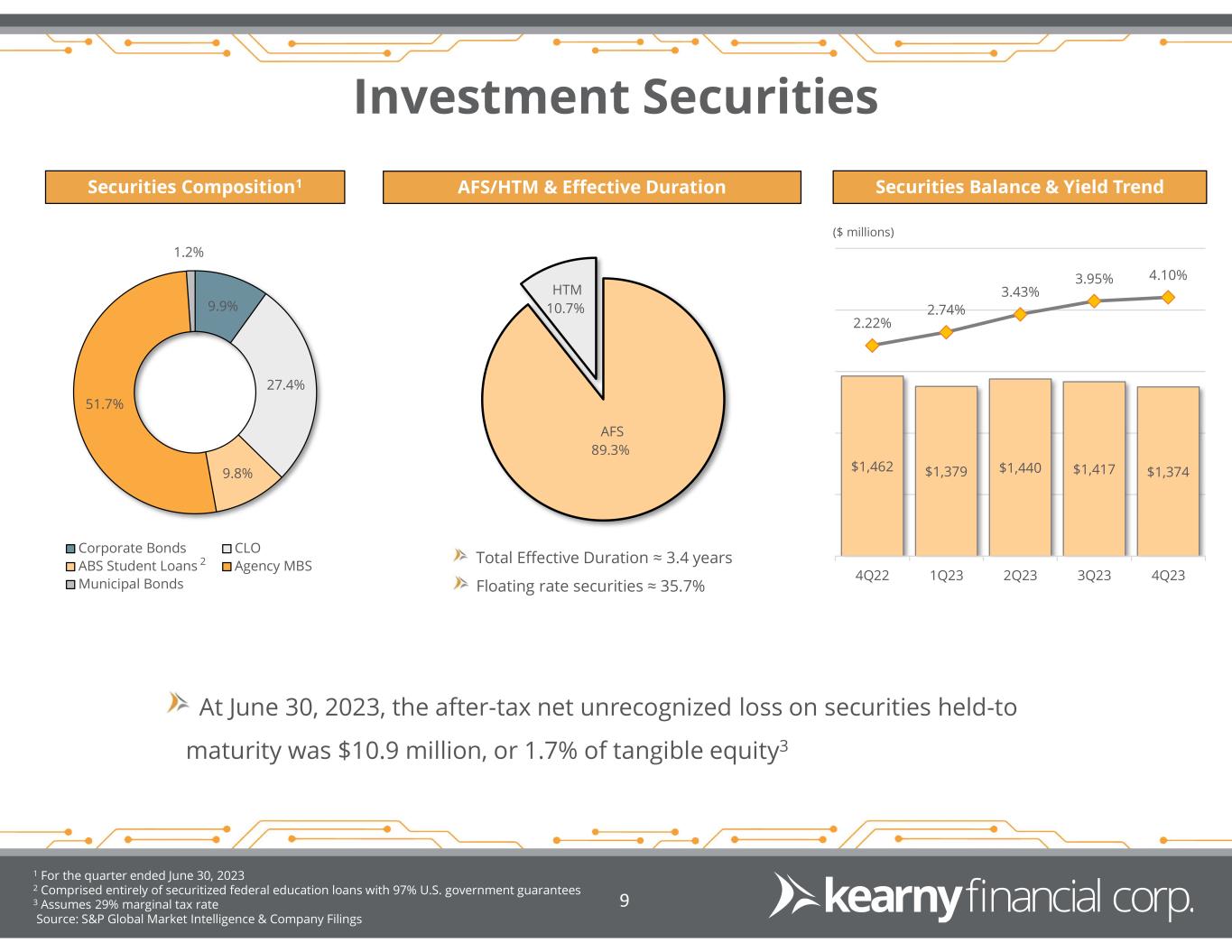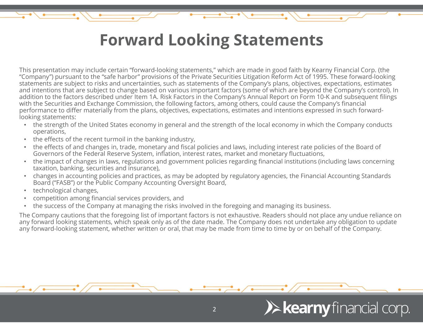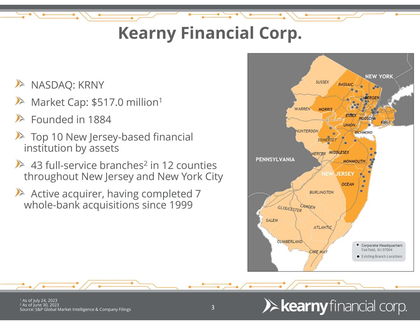 Forward Looking Statements 2 This presentation may include certain “forward-looking statements,” which are made in good faith by Kearny Financial Corp. (the “Company”) pursuant to the “safe harbor” provisions of the Private Securities Litigation Reform Act of 1995. These forward-looking statements are subject to risks and uncertainties, such as statements of the Company’s plans, objectives, expectations, estimates and intentions that are subject to change based on various important factors (some of which are beyond the Company’s control). In addition to the factors described under Item 1A. Risk Factors in the Company’s Annual Report on Form 10-K and subsequent filings with the Securities and Exchange Commission, the following factors, among others, could cause the Company’s financial performance to differ materially from the plans, objectives, expectations, estimates and intentions expressed in such forward- looking statements: • the strength of the United States economy in general and the strength of the local economy in which the Company conducts operations, • the effects of the recent turmoil in the banking industry, • the effects of and changes in, trade, monetary and fiscal policies and laws, including interest rate policies of the Board of Governors of the Federal Reserve System, inflation, interest rates, market and monetary fluctuations, • the impact of changes in laws, regulations and government policies regarding financial institutions (including laws concerning taxation, banking, securities and insurance), • changes in accounting policies and practices, as may be adopted by regulatory agencies, the Financial Accounting Standards Board (“FASB”) or the Public Company Accounting Oversight Board, • technological changes, • competition among financial services providers, and • the success of the Company at managing the risks involved in the foregoing and managing its business. The Company cautions that the foregoing list of important factors is not exhaustive. Readers should not place any undue reliance on any forward looking statements, which speak only as of the date made. The Company does not undertake any obligation to update any forward-looking statement, whether written or oral, that may be made from time to time by or on behalf of the Company.