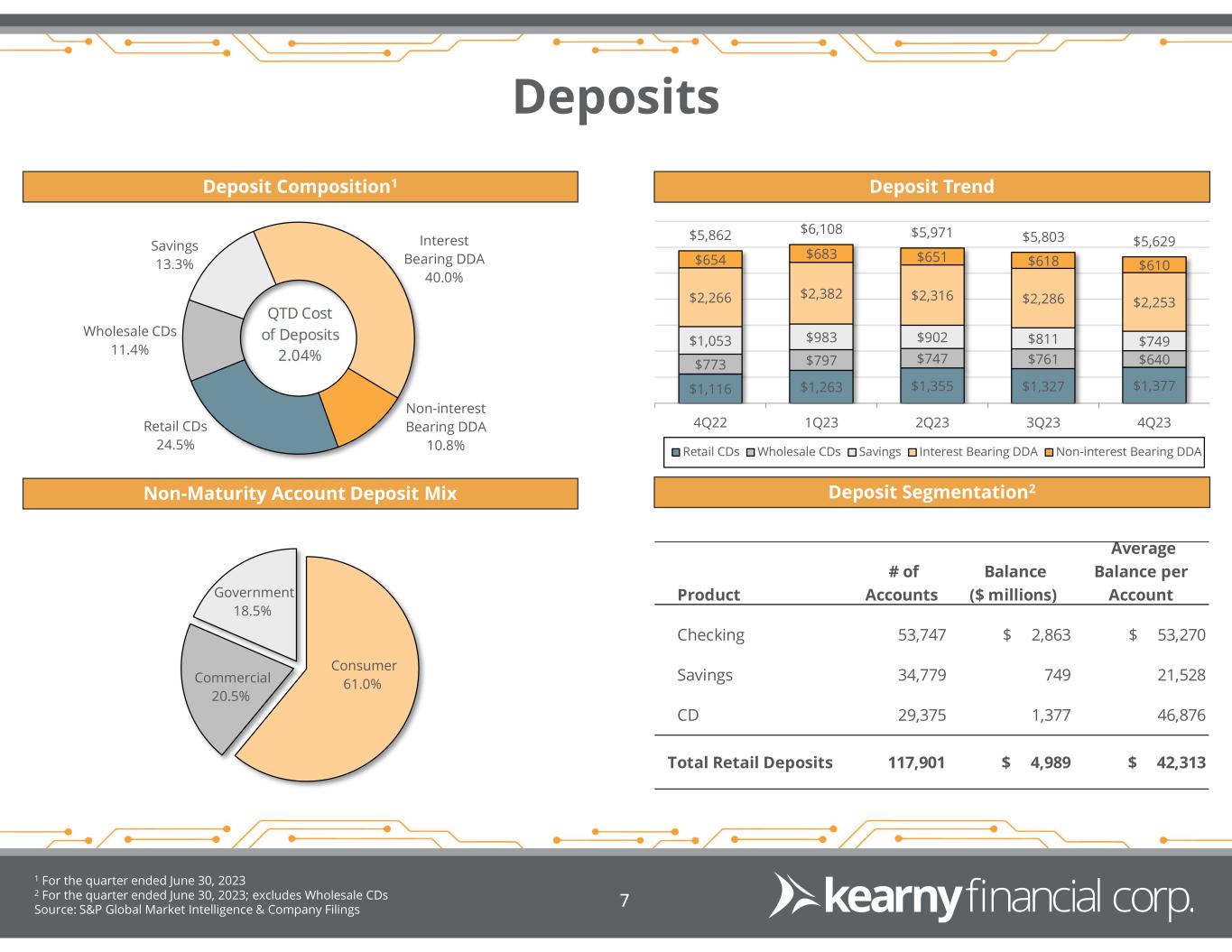 Equity & Capitalization Equity Capitalization Level 1 Kearny Financial Corp. (NASDAQ: KRNY) Regulatory Capital Ratios as of June 30, 2023 are preliminary. 2 S&P U.S. Small Cap Banks Index comprised of 237 constituents, based on March 31, 2023 results. Source: Company Filings 6 Regulatory Capital Ratios1,2 9.06% 8.61% 8.16% 8.02% 8.35% 11.58% 11.09% 10.53% 10.37% 10.78% 4Q22 1Q23 2Q23 3Q23 4Q23 Tangible Common Equity / Tangible Assets Equity / Assets 9.07% 14.07% 14.07% 14.75% 9.60% 11.18% 11.32% 13.97% Tier 1 Leverage Common Equity Tier 1 Tier 1 Risk-Based Capital Total Risk-Based Capital KRNY S&P US Small Cap Banks
