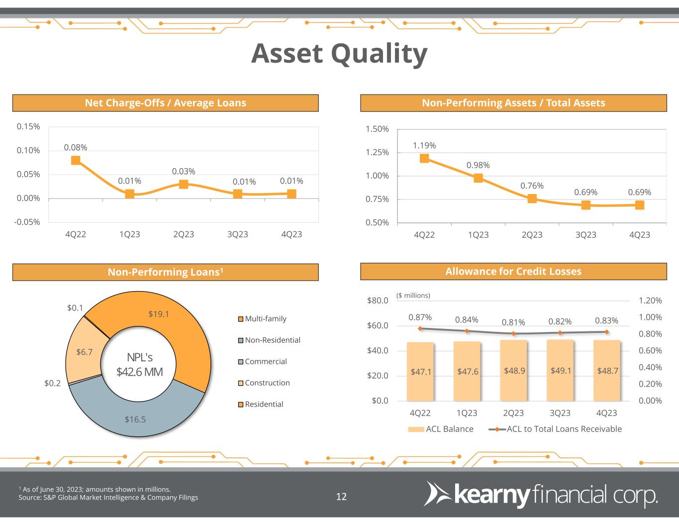 CRE Lending 1 As of June 30, 2023 Source: Company Filings 11 CRE Portfolio by Collateral Type1 Retail 37.6% Mixed Use 27.5% Office 15.4% Industrial 14.9% Specialty & Other 4.6% CRE Loan Geographic Distribution1 Office Portfolio Profile 15.4% of total CRE portfolio or $149 million Average loan size of $1.6 million Weighted average LTV was 52% Total CRE $1.0 B New Jersey 56.2% Brooklyn 10.2% New York (Ex. Brooklyn) 27.2% Pennsylvania 3.9% Other 2.5% WA LTV 52%