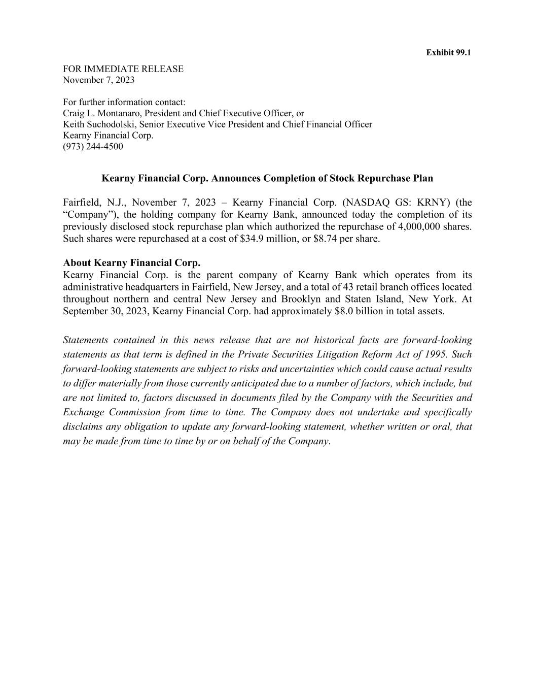 FOR IMMEDIATE RELEASE November 7, 2023 For further information contact: Craig L. Montanaro, President and Chief Executive Officer, or Keith Suchodolski, Senior Executive Vice President and Chief Financial Officer Kearny Financial Corp. (973) 244-4500 Kearny Financial Corp. Announces Completion of Stock Repurchase Plan Fairfield, N.J., November 7, 2023 – Kearny Financial Corp. (NASDAQ GS: KRNY) (the “Company”), the holding company for Kearny Bank, announced today the completion of its previously disclosed stock repurchase plan which authorized the repurchase of 4,000,000 shares. Such shares were repurchased at a cost of $34.9 million, or $8.74 per share. About Kearny Financial Corp. Kearny Financial Corp. is the parent company of Kearny Bank which operates from its administrative headquarters in Fairfield, New Jersey, and a total of 43 retail branch offices located throughout northern and central New Jersey and Brooklyn and Staten Island, New York. At September 30, 2023, Kearny Financial Corp. had approximately $8.0 billion in total assets. Statements contained in this news release that are not historical facts are forward-looking statements as that term is defined in the Private Securities Litigation Reform Act of 1995. Such forward-looking statements are subject to risks and uncertainties which could cause actual results to differ materially from those currently anticipated due to a number of factors, which include, but are not limited to, factors discussed in documents filed by the Company with the Securities and Exchange Commission from time to time. The Company does not undertake and specifically disclaims any obligation to update any forward-looking statement, whether written or oral, that may be made from time to time by or on behalf of the Company. Exhibit 99.1