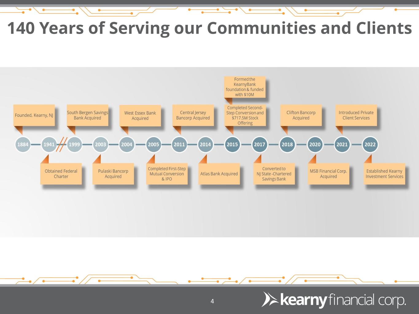 Kearny Financial Corp. NASDAQ: KRNY Market Cap: $531.7 million1 Founded in 1884 Top 10 New Jersey-based financial institution by assets 43 full-service branches2 in 12 counties throughout New Jersey and New York City Active acquirer, having completed 7 whole-bank acquisitions since 1999 1 As of January 23, 2024. 2 As of December 31, 2023. Source: S&P Global Market Intelligence & Company Filings. 3