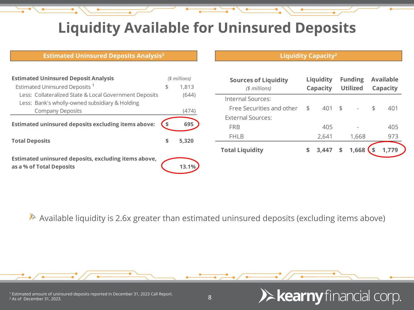 Deposits 1 For the quarter ended December 31, 2023. 2 As of December 31, 2023; excludes Wholesale and state & local government deposits. Source: S&P Global Market Intelligence & Company Filings. 7 Deposit Composition1 Deposit Trend Deposit Segmentation2 Consumer 60.9% Commercial 20.7% Government 18.4% Product # of Accounts Balance ($ millions) Average Balance per Account Checking 53,249 $ 2,282 $ 42,863 Savings 32,687 638 19,510 CD 26,723 1,281 47,939 Total Retail Deposits 112,659 $ 4,201 $ 37,291 Non-Maturity Account Deposit Mix $1,355 $1,327 $1,377 $1,300 $1,284 $747 $761 $640 $613 $458 $902 $811 $749 $689 $646 $2,316 $2,286 $2,253 $2,237 $2,348 $651 $618 $610 $595 $584 $5,971 $5,803 $5,629 $5,434 $5,320 2Q23 3Q23 4Q23 1Q24 2Q24 Wholesale CDs Savings Interest Bearing DDA Non-interest Bearing DDA ($ millions) QTD Cost of Deposits 2.53% Retail CDs 24.1% Wholesale CDs 8.6% Savings 12.1% Interest Bearing DDA 44.2% Non-interest Bearing DDA 11.0%
