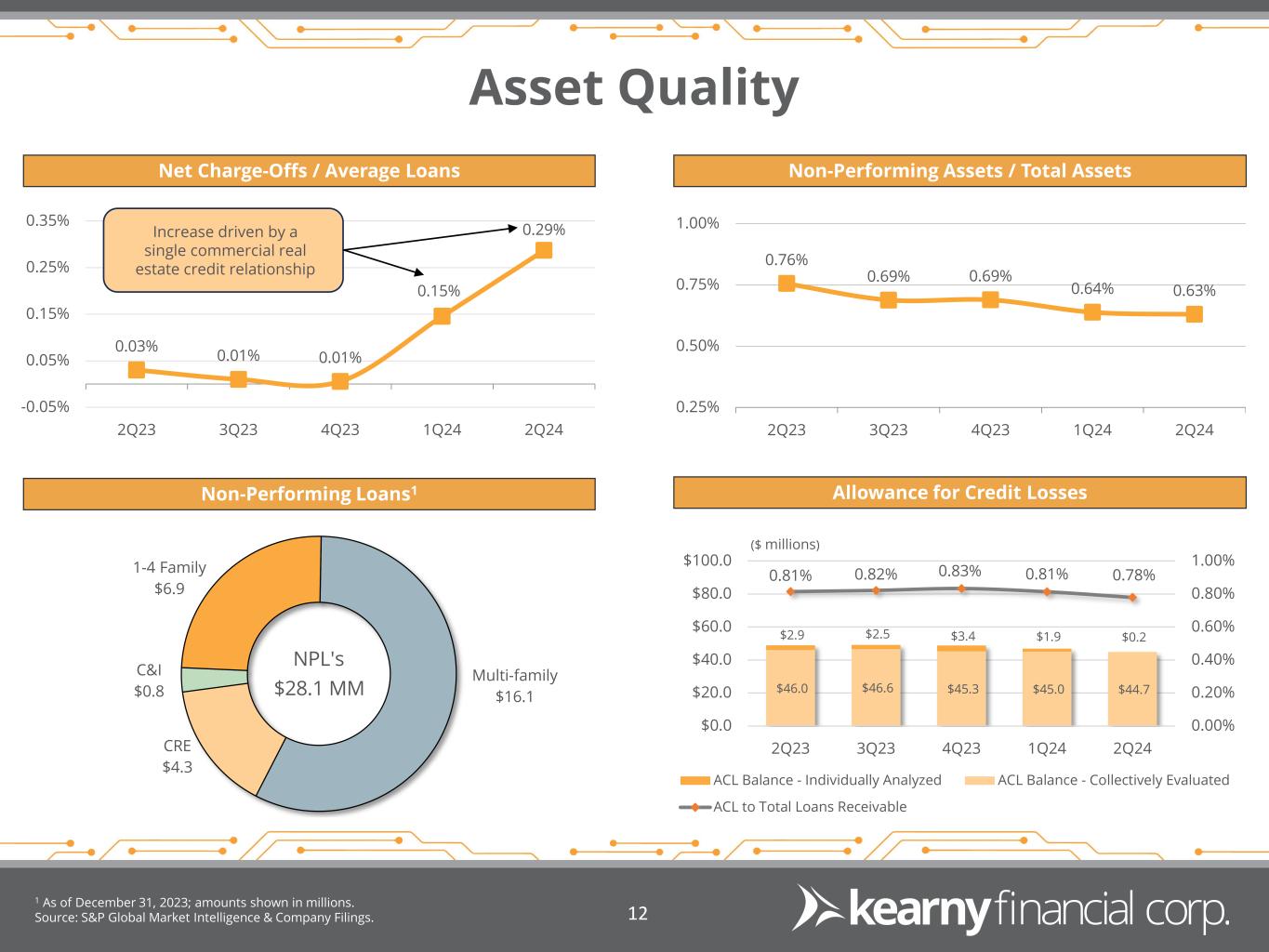 CRE Lending 1 As of December 31, 2023. Source: Company Filings. 11 CRE Portfolio by Collateral Type1 CRE Loan Geographic Distribution1 Total CRE $0.9 B New Jersey 56.1% Brooklyn 9.9% New York (Ex. Brooklyn) 27.6% Pennsylvania 3.8% Other 2.6%Retail 36.6% Mixed Use 27.1% Office 15.8% Industrial 14.8% Specialty & Other 2.1% Medical 3.6%