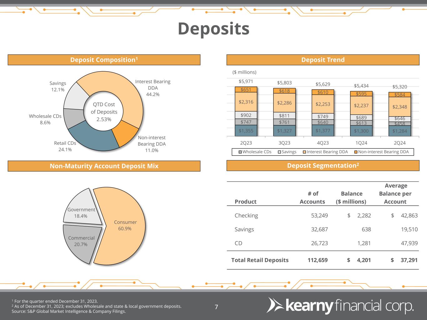 Equity & Capitalization Equity Capitalization Level 1 Kearny Financial Corp. (NASDAQ: KRNY) Regulatory Capital Ratios as of December 31, 2023 are preliminary. 2 S&P U.S. Small Cap Banks Index comprised of 246 constituents, based on September 30, 2023 results. Source: Company Filings. 6 Regulatory Capital Ratios1,2 8.89% 14.42% 14.42% 15.17% 9.62% 11.37% 11.60% 14.04% Tier 1 Leverage Common Equity Tier 1 Tier 1 Risk-Based Capital Total Risk-Based Capital KRNY S&P US Small Cap Banks 8.16% 8.02% 8.35% 8.20% 8.26% 10.53% 10.37% 10.78% 10.65% 10.74% 2Q23 3Q23 4Q23 1Q24 2Q24 Tangible Common Equity / Tangible Assets Equity / Assets
