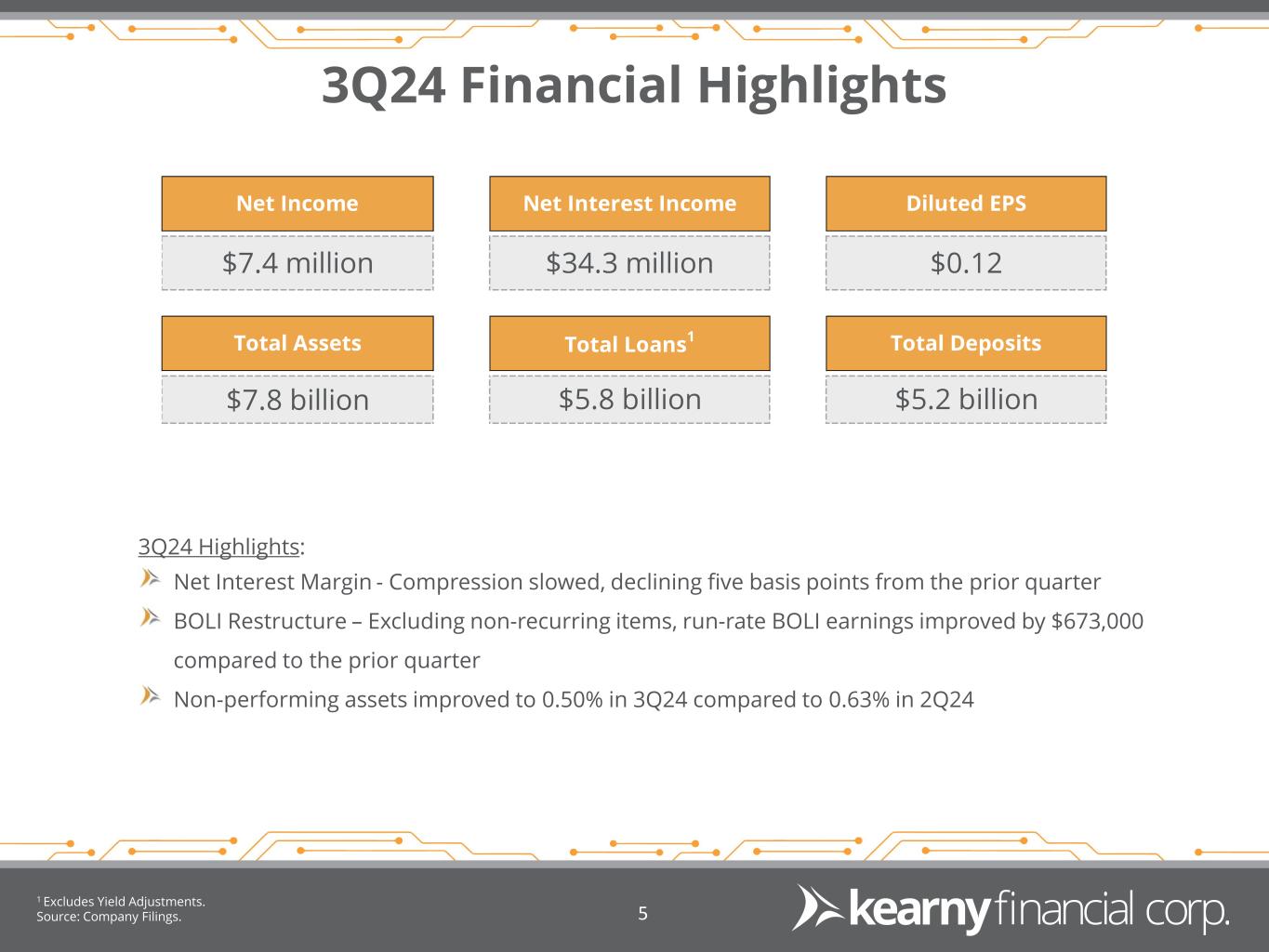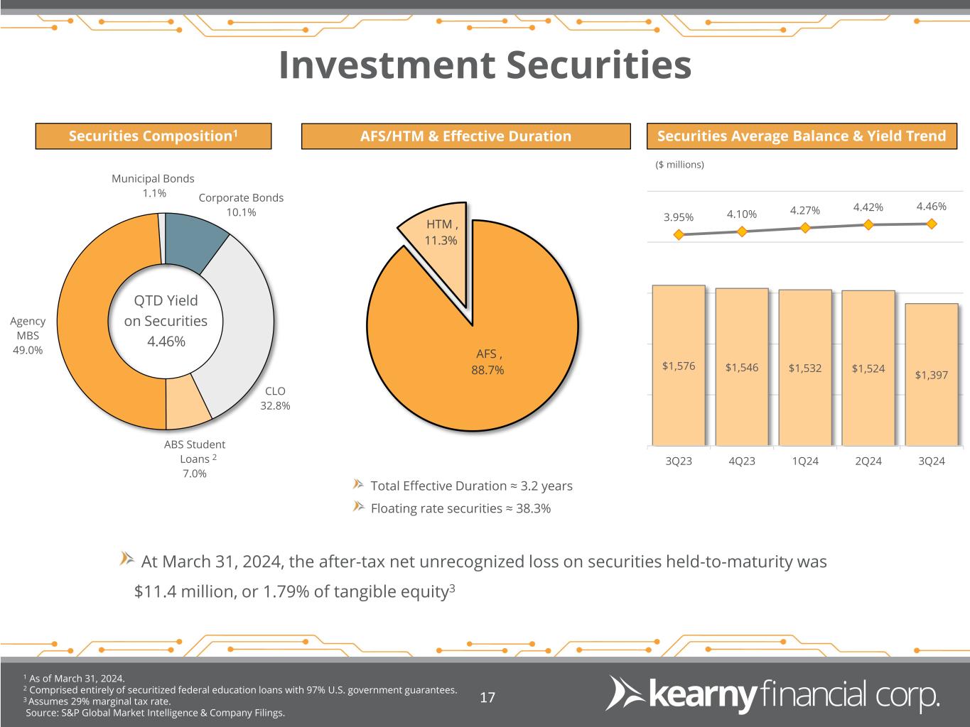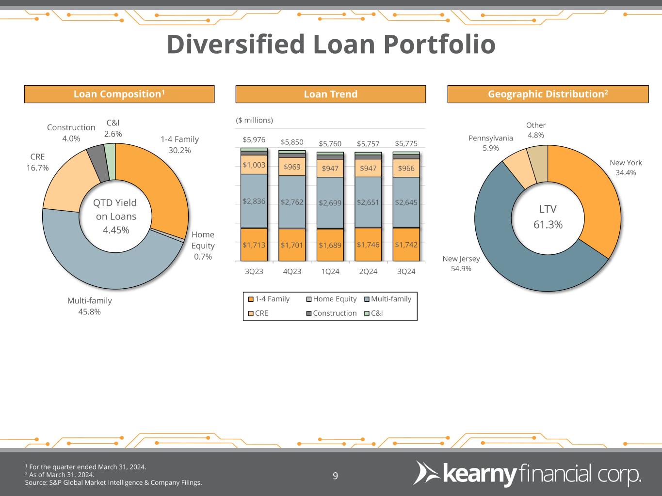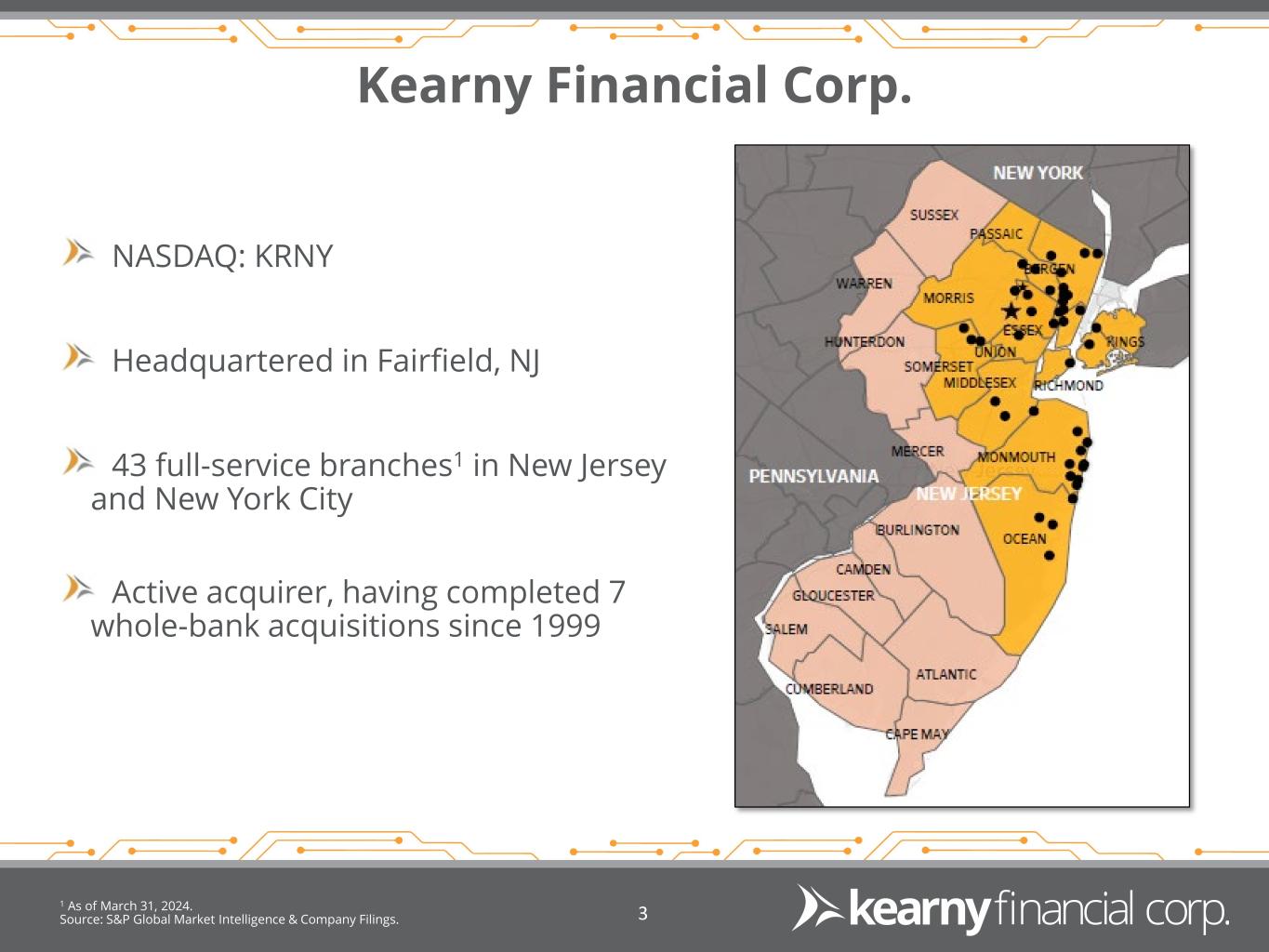 Forward Looking Statements & Financial Measures 2 This presentation may include certain “forward-looking statements,” which are made in good faith by Kearny Financial Corp. (the “Company”) pursuant to the “safe harbor” provisions of the Private Securities Litigation Reform Act of 1995. These forward-looking statements are subject to risks and uncertainties, such as statements of the Company’s plans, objectives, expectations, estimates and intentions that are subject to change based on various important factors (some of which are beyond the Company’s control). In addition to the factors described under Item 1A. Risk Factors in the Company’s Annual Report on Form 10-K, and subsequent filings with the Securities and Exchange Commission, the following factors, among others, could cause the Company’s financial performance to differ materially from the plans, objectives, expectations, estimates and intentions expressed in such forward-looking statements: • the strength of the United States economy in general and the strength of the local economy in which the Company conducts operations, • the effects of, and changes in, trade, monetary and fiscal policies and laws, including interest rate policies of the Board of Governors of the Federal Reserve System, inflation, interest rates, market and monetary fluctuations, • the impact of changes in laws, regulations and government policies regarding financial institutions (including laws concerning taxation, banking, securities and insurance), • changes in accounting policies and practices, as may be adopted by regulatory agencies, the Financial Accounting Standards Board (“FASB”) or the Public Company Accounting Oversight Board, • technological changes, • competition among financial services providers, and • the success of the Company at managing the risks involved in the foregoing and managing its business. The Company cautions that the foregoing list of important factors is not exhaustive. Readers should not place any undue reliance on any forward looking statements, which speak only as of the date made. The Company does not undertake any obligation to update any forward-looking statement, whether written or oral, that may be made from time to time by or on behalf of the Company.