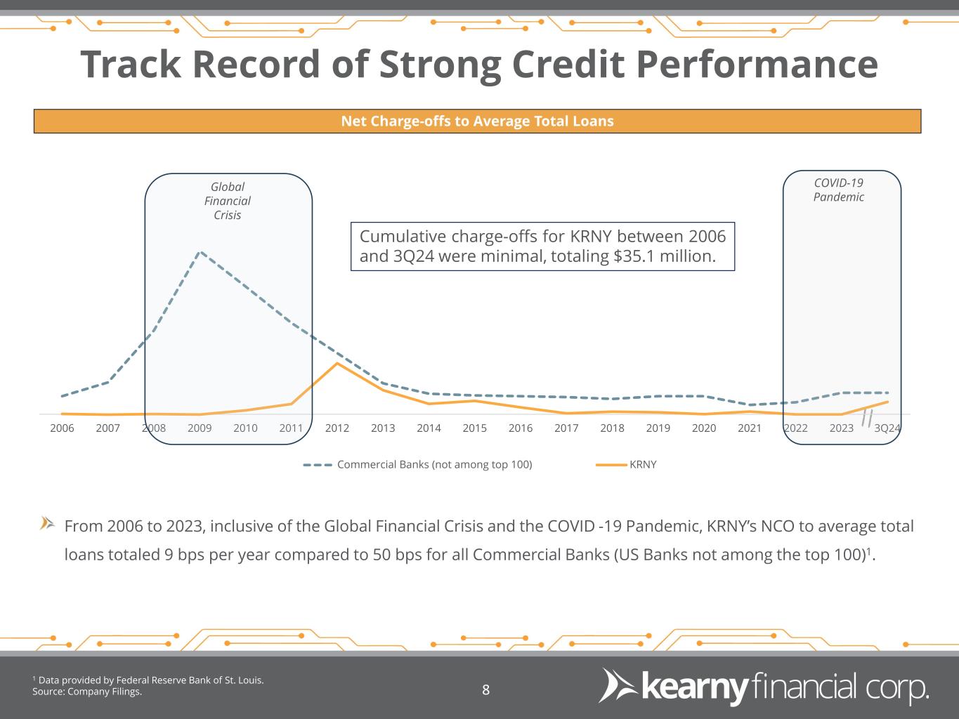 7 Conservative Underwriting Culture Comprehensive CRE / Multifamily Underwriting Highly disciplined LTV and DSCR standards Interest rates stressed a minimum of +300bps at origination DSCR based on in-place rents, not projections, with conservative allowances for vacancy NOI underwritten to include forecasted expense increases and full taxes (where a tax abatement exists) Approval Authority & Underwriting Consistency Lending authority aggregated by borrower/group of related borrowers Technology ensures consistent and efficient underwriting and risk rating process Multi-faceted Loan Review & Stress Testing Semi-annual third-party loan-level stress testing and annual capital-based stress testing Quarterly third-party portfolio loan review with 65% of total portfolio reviewed on an annual basis Annual internal loan reviews on all commercial loans with balances of $2.5 million or greater Proactive Workout Process Dedicated team of portfolio managers and loan workout specialists Weekly meetings comprised of loan officers, credit personnel and special assets group to pre-emptively address delinquencies or problem credits Philosophy of aggressively addressing impaired assets in a timely fashion Senior Credit Officer Approval Management Loan Committee Approval Board Loan Committee Approval