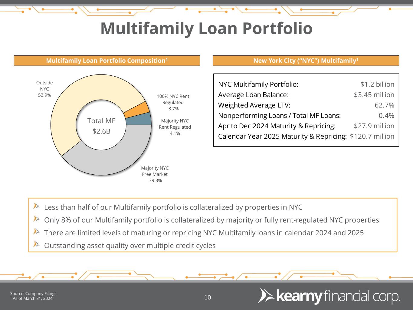 Diversified Loan Portfolio Loan Composition1 Geographic Distribution2Loan Trend 1 For the quarter ended March 31, 2024. 2 As of March 31, 2024. Source: S&P Global Market Intelligence & Company Filings. 9 ($ millions) 1-4 Family 30.2% Home Equity 0.7% Multi-family 45.8% CRE 16.7% Construction 4.0% C&I 2.6% QTD Yield on Loans 4.45% $1,713 $1,701 $1,689 $1,746 $1,742 $2,836 $2,762 $2,699 $2,651 $2,645 $1,003 $969 $947 $947 $966 $5,976 $5,850 $5,760 $5,757 $5,775 3Q23 4Q23 1Q24 2Q24 3Q24 1-4 Family Home Equity Multi-family CRE Construction C&I New York 34.4% New Jersey 54.9% Pennsylvania 5.9% Other 4.8% LTV 61.3%