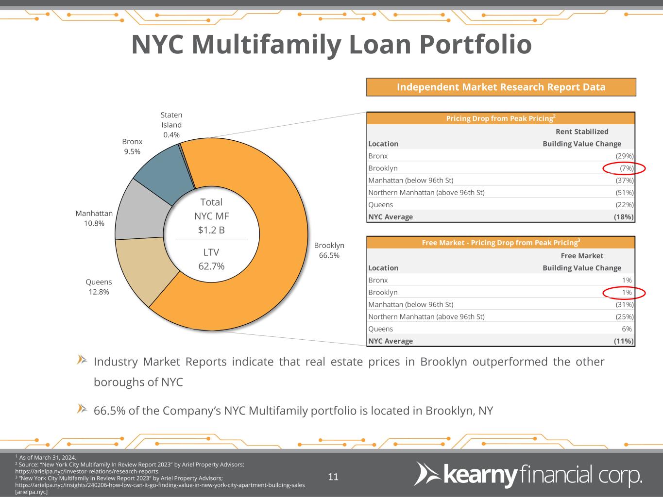 Multifamily Loan Portfolio Multifamily Loan Portfolio Composition1 New York City (“NYC”) Multifamily1 Source: Company Filings 1 As of March 31, 2024. 10 Less than half of our Multifamily portfolio is collateralized by properties in NYC Only 8% of our Multifamily portfolio is collateralized by majority or fully rent-regulated NYC properties There are limited levels of maturing or repricing NYC Multifamily loans in calendar 2024 and 2025 Outstanding asset quality over multiple credit cycles NYC Multifamily Portfolio: $1.2 billion Average Loan Balance: $3.45 million Weighted Average LTV: 62.7% Nonperforming Loans / Total MF Loans: 0.4% Apr to Dec 2024 Maturity & Repricing: $27.9 million Calendar Year 2025 Maturity & Repricing: $120.7 million Majority NYC Free Market 39.3% Outside NYC 52.9% 100% NYC Rent Regulated 3.7% Majority NYC Rent Regulated 4.1% Total MF $2.6B