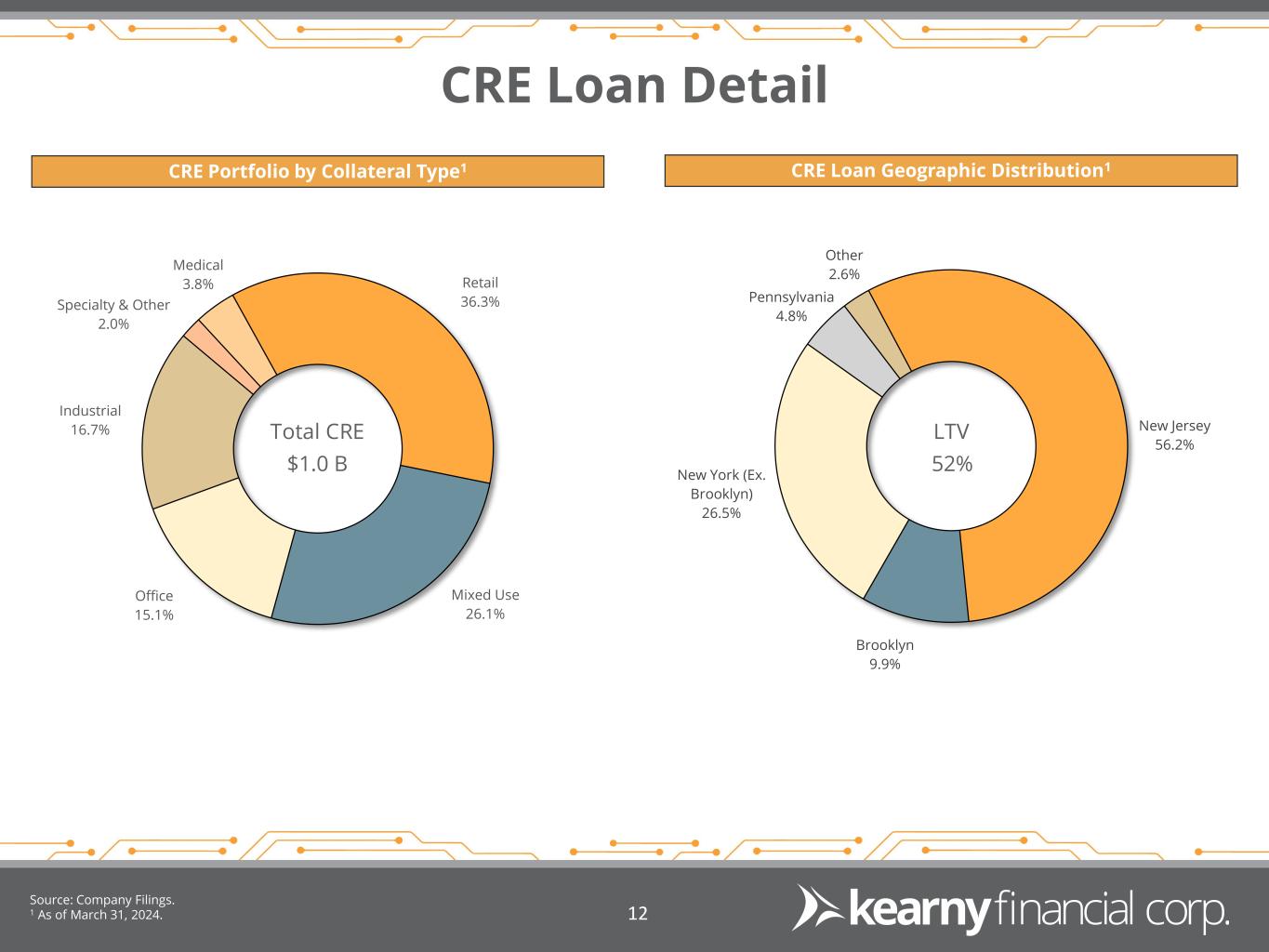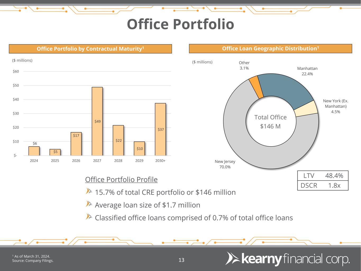 CRE Loan Detail Source: Company Filings. 1 As of March 31, 2024. 12 CRE Portfolio by Collateral Type1 CRE Loan Geographic Distribution1 Retail 36.3% Mixed Use 26.1% Office 15.1% Industrial 16.7% Specialty & Other 2.0% Medical 3.8% New Jersey 56.2% Brooklyn 9.9% New York (Ex. Brooklyn) 26.5% Pennsylvania 4.8% Other 2.6% Total CRE $1.0 B LTV 52%