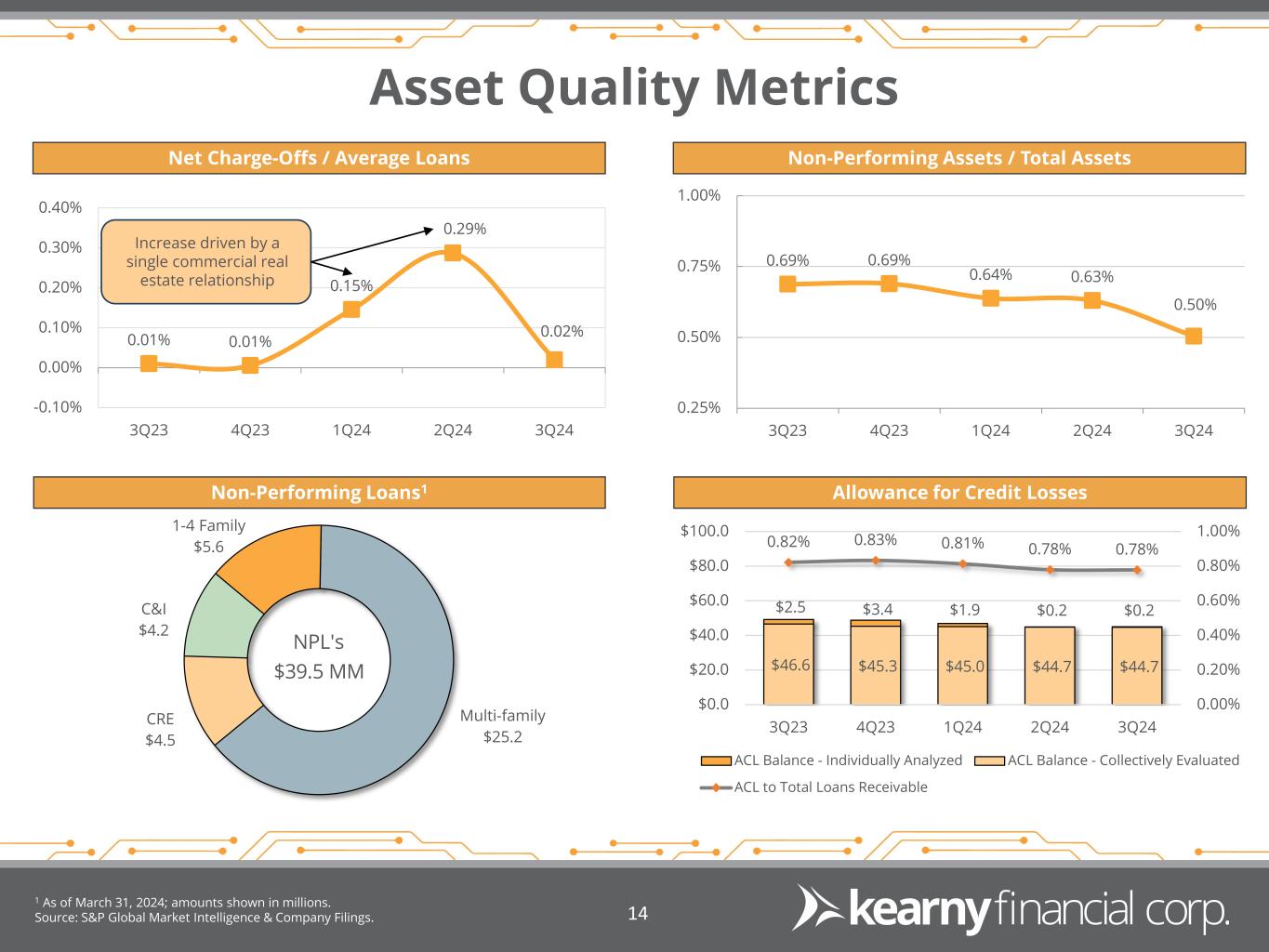 Office Portfolio 1 As of March 31, 2024. Source: Company Filings. 13 Office Portfolio by Contractual Maturity1 Office Loan Geographic Distribution1 Office Portfolio Profile 15.7% of total CRE portfolio or $146 million Average loan size of $1.7 million Classified office loans comprised of 0.7% of total office loans ($ millions) ($ millions) $6 $5 $17 $49 $22 $10 $37 $- $10 $20 $30 $40 $50 $60 2024 2025 2026 2027 2028 2029 2030+ Other 3.1% Manhattan 22.4% New York (Ex. Manhattan) 4.5% New Jersey 70.0% Total Office $146 M LTV 48.4% DSCR 1.8x