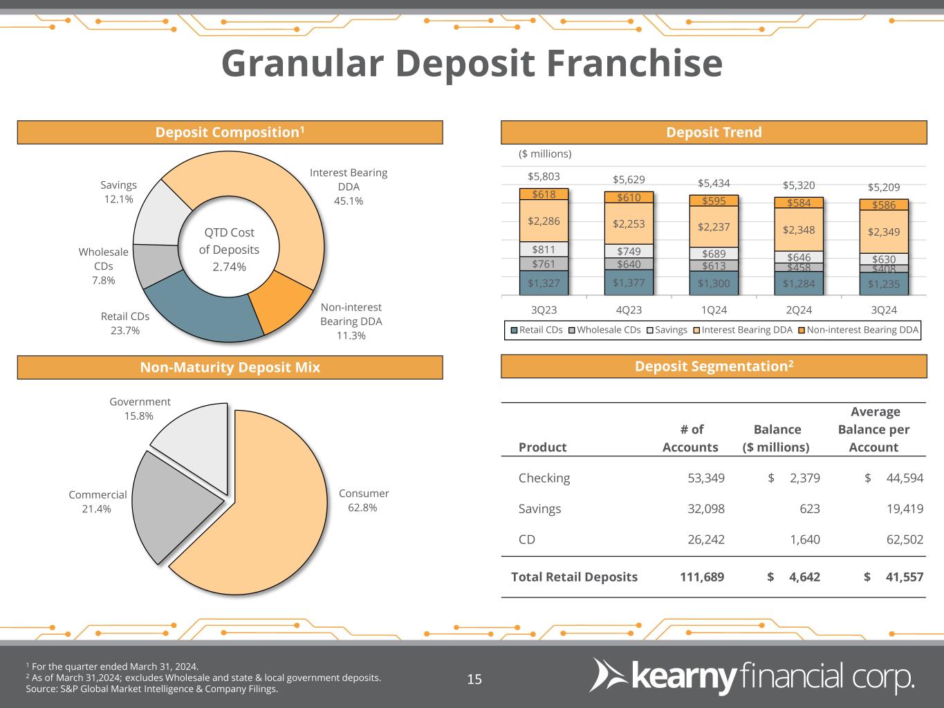 Asset Quality Metrics Non-Performing Assets / Total Assets Non-Performing Loans1 Allowance for Credit Losses 1 As of March 31, 2024; amounts shown in millions. Source: S&P Global Market Intelligence & Company Filings. 14 NPL's $39.5 MM 0.69% 0.69% 0.64% 0.63% 0.50% 0.25% 0.50% 0.75% 1.00% 3Q23 4Q23 1Q24 2Q24 3Q24 Multi-family $25.2 CRE $4.5 C&I $4.2 1-4 Family $5.6 NPL's $39.5 MM $46.6 $45.3 $45.0 $44.7 $44.7 $2.5 $3.4 $1.9 $0.2 $0.2 0.82% 0.83% 0.81% 0.78% 0.78% 0.00% 0.20% 0.40% 0.60% 0.80% 1.00% $0.0 $20.0 $40.0 $60.0 $80.0 $100.0 3Q23 4Q23 1Q24 2Q24 3Q24 ACL Balance - Individually Analyzed ACL Balance - Collectively Evaluated ACL to Total Loans Receivable Net Charge-Offs / Average Loans 0.01% 0.01% 0.15% 0.29% 0.02% -0.10% 0.00% 0.10% 0.20% 0.30% 0.40% 3Q23 4Q23 1Q24 2Q24 3Q24 Increase driven by a single commercial real estate relationship