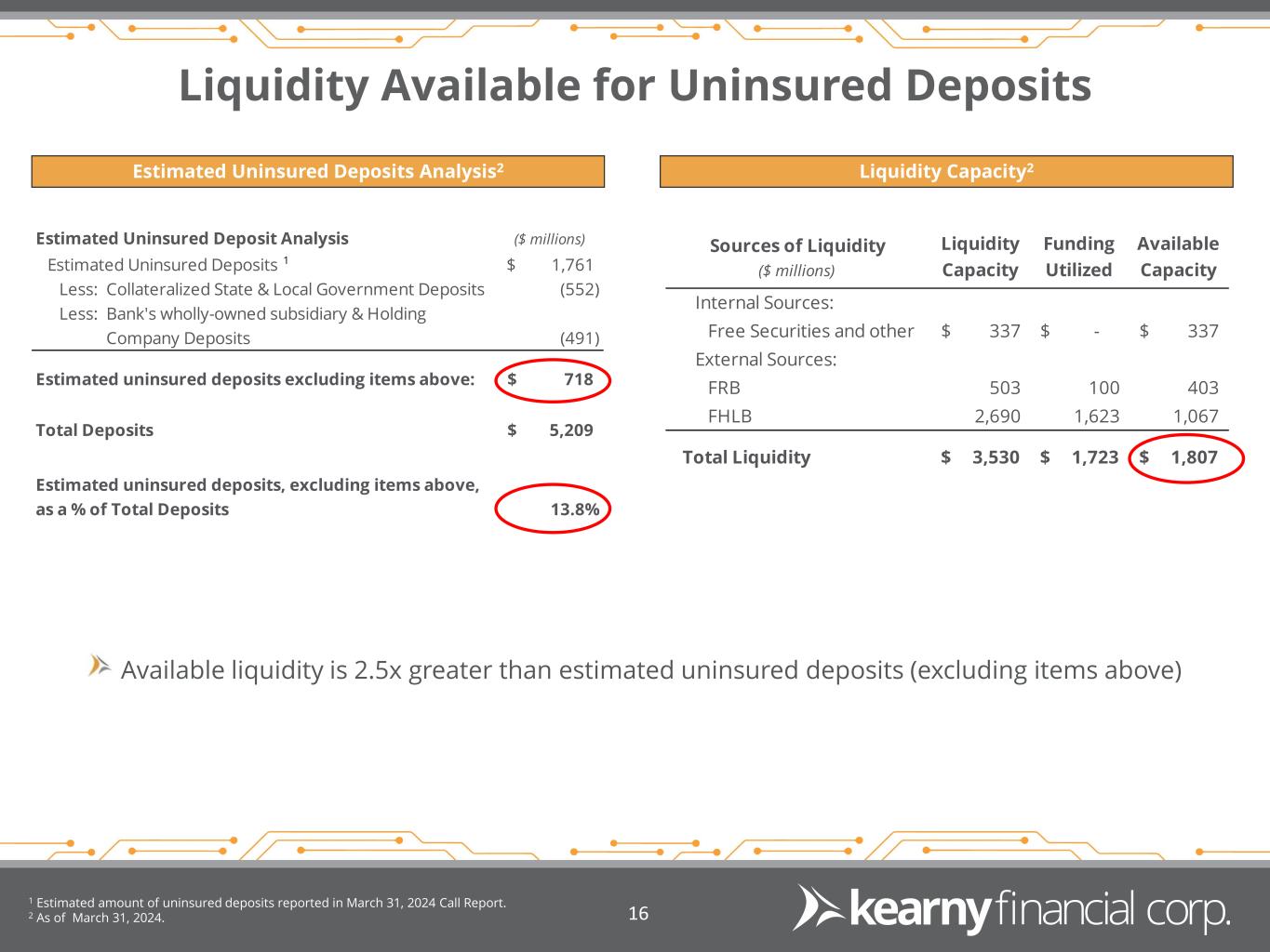 Liquidity Available for Uninsured Deposits Estimated Uninsured Deposits Analysis2 1 Estimated amount of uninsured deposits reported in March 31, 2024 Call Report. 2 As of March 31, 2024. 16 Available liquidity is 2.5x greater than estimated uninsured deposits (excluding items above) Liquidity Capacity2 Estimated Uninsured Deposit Analysis ($ millions) Estimated Uninsured Deposits 1,761$ Less: Collateralized State & Local Government Deposits (552) Less: Bank's wholly-owned subsidiary & Holding Company Deposits (491) Estimated uninsured deposits excluding items above: 718$ Total Deposits 5,209$ Estimated uninsured deposits, excluding items above, as a % of Total Deposits 13.8% 1 Sources of Liquidity ($ millions) Liquidity Capacity Funding Utilized Available Capacity Internal Sources: Free Securities and other 337$ -$ 337$ External Sources: FRB 503 100 403 FHLB 2,690 1,623 1,067 Total Liquidity 3,530$ 1,723$ 1,807$