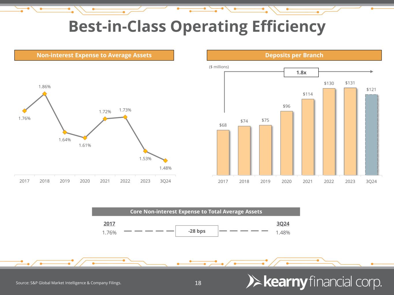 Investment Securities 1 As of March 31, 2024. 2 Comprised entirely of securitized federal education loans with 97% U.S. government guarantees. 3 Assumes 29% marginal tax rate. Source: S&P Global Market Intelligence & Company Filings. 17 Securities Composition1 Securities Average Balance & Yield TrendAFS/HTM & Effective Duration Total Effective Duration ≈ 3.2 years Floating rate securities ≈ 38.3% ($ millions) $1,576 $1,546 $1,532 $1,524 $1,397 3.95% 4.10% 4.27% 4.42% 4.46% 3Q23 4Q23 1Q24 2Q24 3Q24 Corporate Bonds 10.1% CLO 32.8% ABS Student Loans 7.0% Agency MBS 49.0% Municipal Bonds 1.1% 2 QTD Yield on Securities 4.46% AFS , 88.7% HTM , 11.3% At March 31, 2024, the after-tax net unrecognized loss on securities held-to-maturity was $11.4 million, or 1.79% of tangible equity3