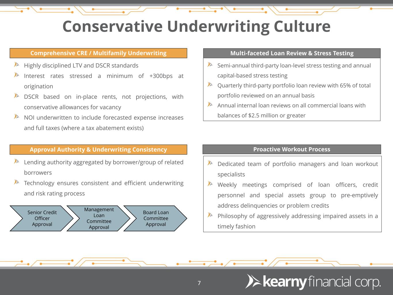 Capital Strength Equity Capitalization Level 1 Kearny Financial Corp. (NASDAQ: KRNY) Regulatory Capital Ratios as of June 30, 2024 are preliminary. 2 S&P U.S. Small Cap Banks Index comprised of 241 constituents, based on March 31, 2024 results. 3 Equity to Asset ratio, as of June 30, 2024, was impacted by previously mentioned goodwill impairment. Source: Company Filings. 6 Regulatory Capital Ratios1,2 8.35% 8.20% 8.26% 8.34% 8.43% 10.78% 10.65% 10.74% 10.83% 9.81% 4Q23 1Q24 2Q24 3Q24 4Q24 Tangible Common Equity / Tangible Assets Equity / Assets 9.15% 14.79% 14.79% 15.57% 9.75% 11.68% 11.90% 14.35% Tier 1 Leverage Common Equity Tier 1 Tier 1 Risk-Based Capital Total Risk-Based Capital KRNY S&P US Small Cap Banks 3