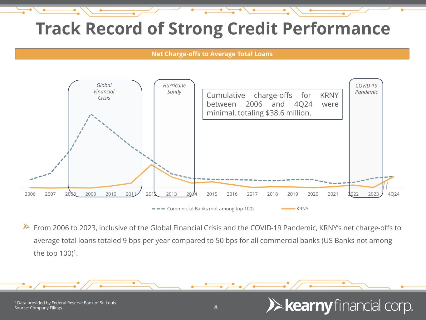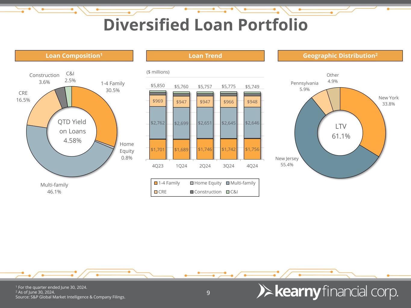 Track Record of Strong Credit Performance 1 Data provided by Federal Reserve Bank of St. Louis. Source: Company Filings. 8 From 2006 to 2023, inclusive of the Global Financial Crisis and the COVID-19 Pandemic, KRNY’s net charge-offs to average total loans totaled 9 bps per year compared to 50 bps for all commercial banks (US Banks not among the top 100)1. Net Charge-offs to Average Total Loans 2006 2007 2008 2009 2010 2011 2012 2013 2014 2015 2016 2017 2018 2019 2020 2021 2022 2023 4Q24 Commercial Banks (not among top 100) KRNY Global Financial Crisis Hurricane Sandy COVID-19 Pandemic Cumulative charge-offs for KRNY between 2006 and 4Q24 were minimal, totaling $38.6 million.