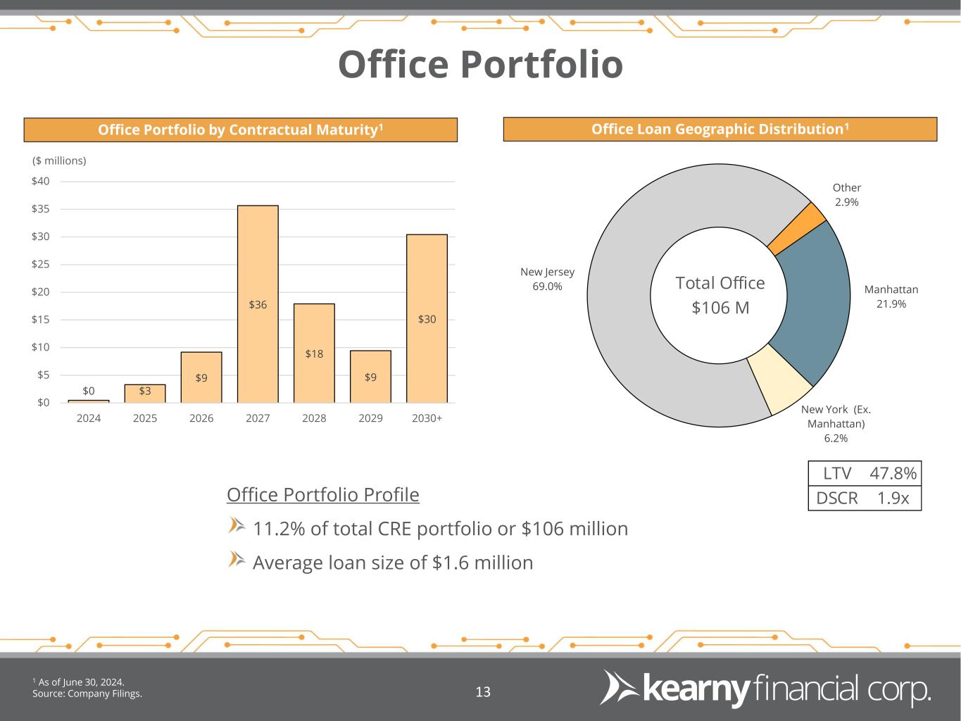 CRE Loan Detail Source: Company Filings. 1 As of June 30, 2024. 12 CRE Portfolio by Collateral Type1 CRE Loan Geographic Distribution1 Retail 34.7% Mixed Use 28.5% Office 11.2% Industrial 16.6% Specialty & Other 4.6% Medical 4.4% New Jersey 57.1% Brooklyn 9.2% New York (Ex. Brooklyn) 25.8% Pennsylvania 4.9% Other 3.0% Total CRE $0.9 B LTV 52%
