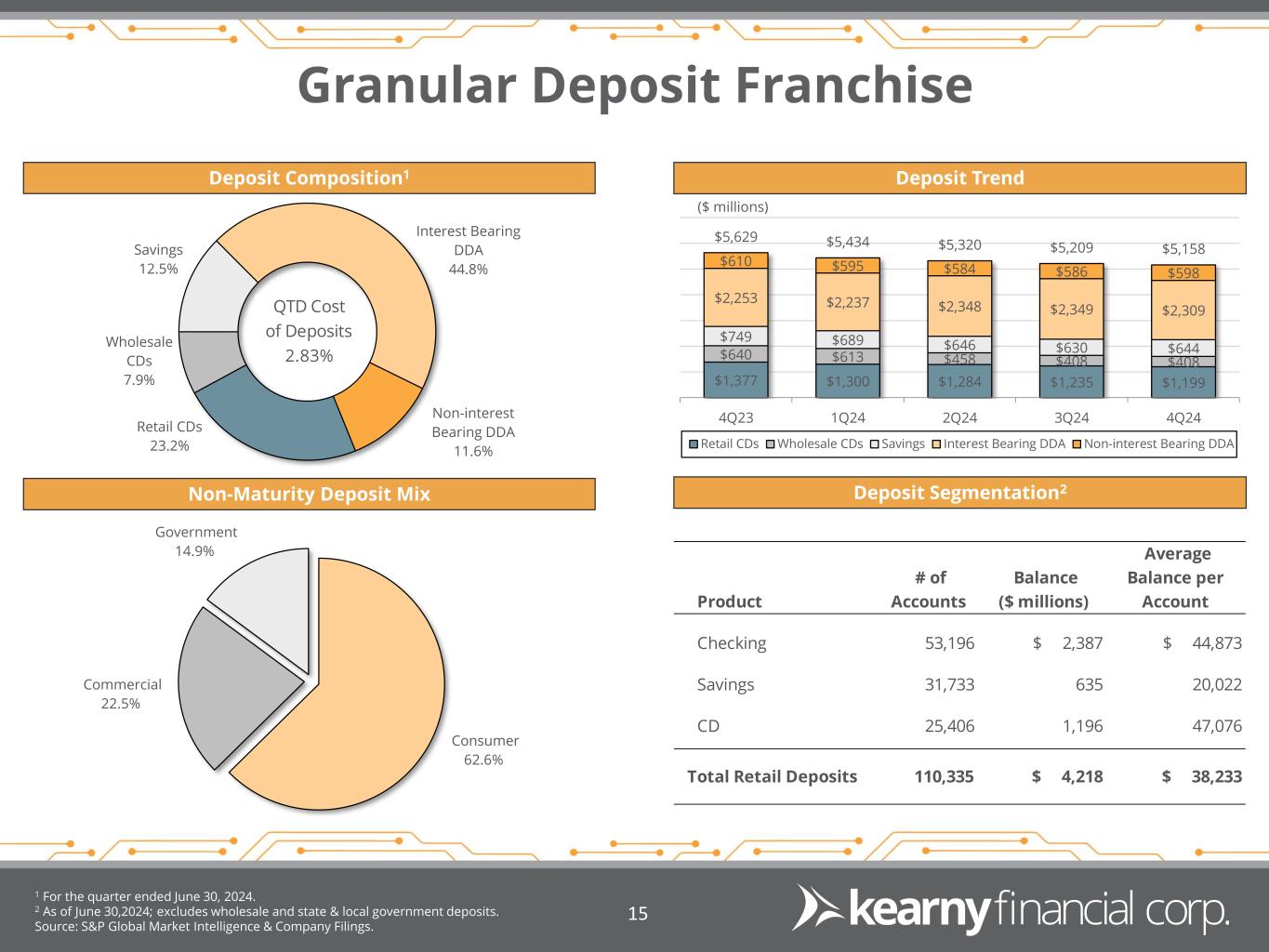 Asset Quality Metrics Non-Performing Assets / Total Assets Non-Performing Loans1 Allowance for Credit Losses 1 As of June 30, 2024; amounts shown in millions. Source: S&P Global Market Intelligence & Company Filings. 14 NPL's $39.5 MM 0.69% 0.64% 0.63% 0.50% 0.52% 0.45% 0.50% 0.55% 0.60% 0.65% 0.70% 0.75% 4Q23 1Q24 2Q24 3Q24 4Q24 Multi-family $22.7 CRE $9.8 C&I $0.7 1-4 Family $6.7 Net Charge-Offs / Average Loans 0.01% 0.15% 0.29% 0.02% 0.25% -0.10% 0.00% 0.10% 0.20% 0.30% 0.40% 4Q23 1Q24 2Q24 3Q24 4Q24 Increase driven by a single commercial real estate relationship Increase driven by a single C&I relationship $45.3 $45.0 $44.7 $44.7 $44.1 $3.4 $1.9 $0.2 $0.2 $0.9 0.83% 0.81% 0.78% 0.78% 0.78% 0.00% 0.20% 0.40% 0.60% 0.80% 1.00% $0.0 $20.0 $40.0 $60.0 $80.0 $100.0 4Q23 1Q24 2Q24 3Q24 4Q24 ACL Balance - Collectively Evaluated ACL Balance - Individually Analyzed ACL to Total Loans Receivable NPL's $39.9 M $ in millions