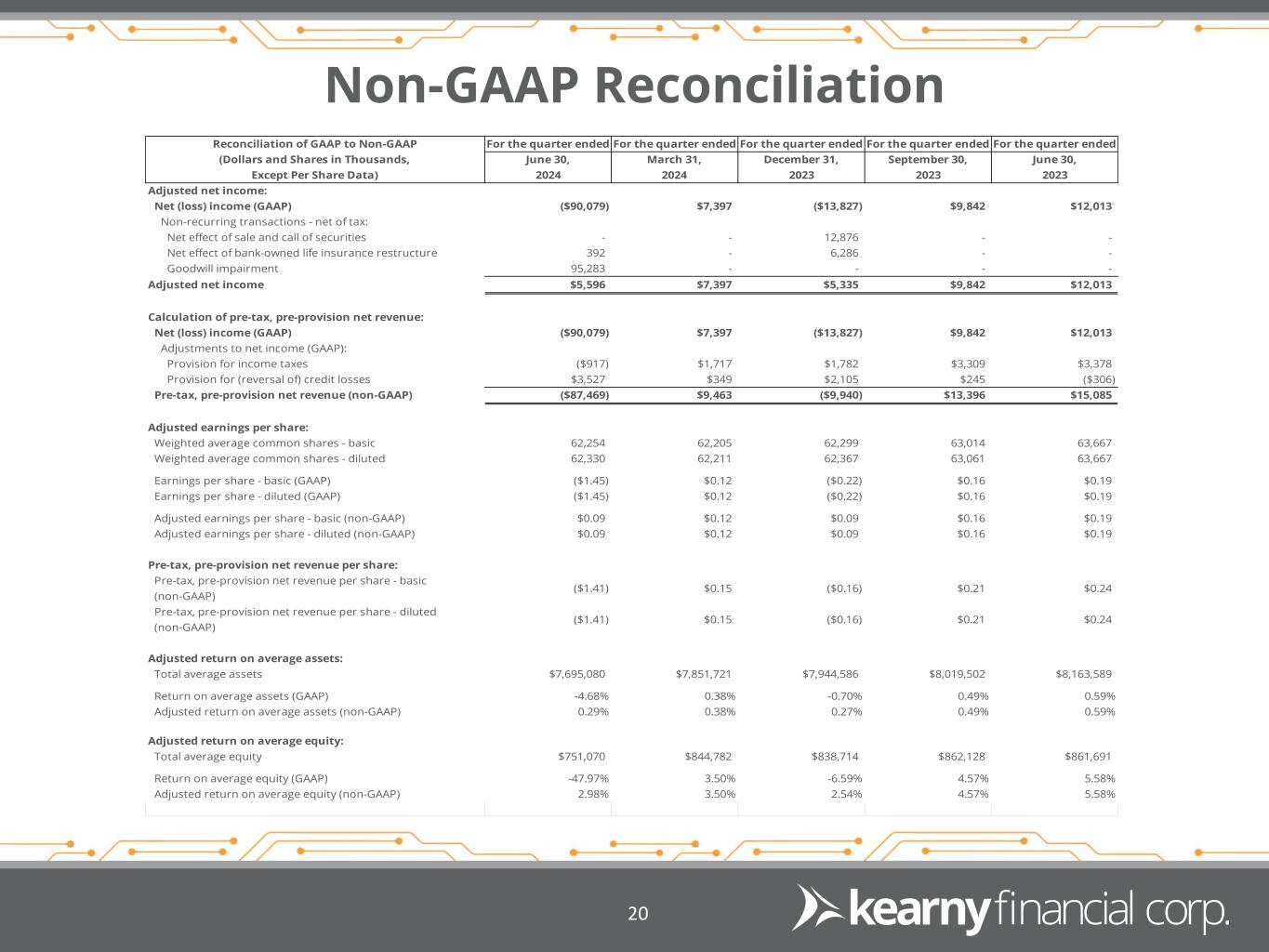Non-GAAP Reconciliation 20 Reconciliation of GAAP to Non-GAAP For the quarter ended For the quarter ended For the quarter ended For the quarter ended For the quarter ended (Dollars and Shares in Thousands, Except Per Share Data) June 30, 2024 March 31, 2024 December 31, 2023 September 30, 2023 June 30, 2023 Adjusted net income: Net (loss) income (GAAP) ($90,079) $7,397 ($13,827) $9,842 $12,013 Non-recurring transactions - net of tax: Net effect of sale and call of securities - - 12,876 - - Net effect of bank-owned life insurance restructure 392 - 6,286 - - Goodwill impairment 95,283 - - - - Adjusted net income $5,596 $7,397 $5,335 $9,842 $12,013 Calculation of pre-tax, pre-provision net revenue: Net (loss) income (GAAP) ($90,079) $7,397 ($13,827) $9,842 $12,013 Adjustments to net income (GAAP): Provision for income taxes ($917) $1,717 $1,782 $3,309 $3,378 Provision for (reversal of) credit losses $3,527 $349 $2,105 $245 ($306) Pre-tax, pre-provision net revenue (non-GAAP) ($87,469) $9,463 ($9,940) $13,396 $15,085 Adjusted earnings per share: Weighted average common shares - basic 62,254 62,205 62,299 63,014 63,667 Weighted average common shares - diluted 62,330 62,211 62,367 63,061 63,667 Earnings per share - basic (GAAP) ($1.45) $0.12 ($0.22) $0.16 $0.19 Earnings per share - diluted (GAAP) ($1.45) $0.12 ($0.22) $0.16 $0.19 Adjusted earnings per share - basic (non-GAAP) $0.09 $0.12 $0.09 $0.16 $0.19 Adjusted earnings per share - diluted (non-GAAP) $0.09 $0.12 $0.09 $0.16 $0.19 Pre-tax, pre-provision net revenue per share: Pre-tax, pre-provision net revenue per share - basic (non-GAAP) ($1.41) $0.15 ($0.16) $0.21 $0.24 Pre-tax, pre-provision net revenue per share - diluted (non-GAAP) ($1.41) $0.15 ($0.16) $0.21 $0.24 Adjusted return on average assets: Total average assets $7,695,080 $7,851,721 $7,944,586 $8,019,502 $8,163,589 Return on average assets (GAAP) -4.68% 0.38% -0.70% 0.49% 0.59% Adjusted return on average assets (non-GAAP) 0.29% 0.38% 0.27% 0.49% 0.59% Adjusted return on average equity: Total average equity $751,070 $844,782 $838,714 $862,128 $861,691 Return on average equity (GAAP) -47.97% 3.50% -6.59% 4.57% 5.58% Adjusted return on average equity (non-GAAP) 2.98% 3.50% 2.54% 4.57% 5.58%