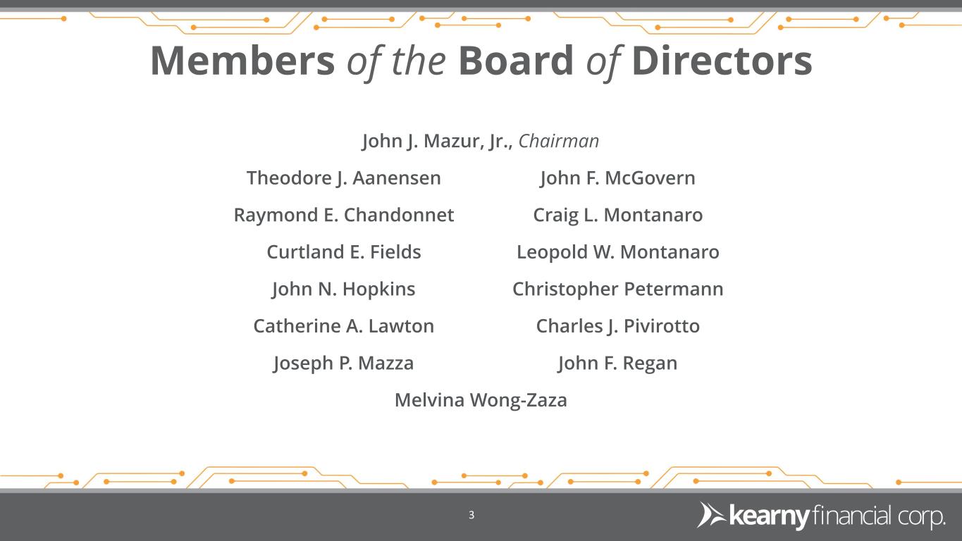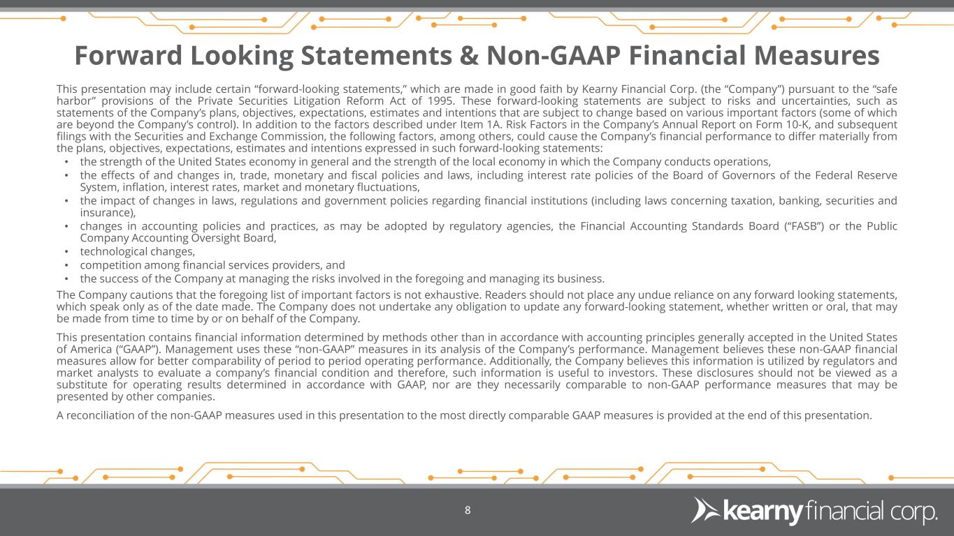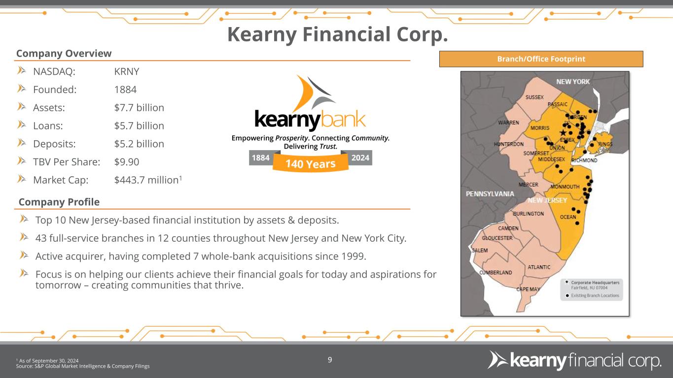 Forward Looking Statements & Non-GAAP Financial Measures 8 This presentation may include certain “forward-looking statements,” which are made in good faith by Kearny Financial Corp. (the “Company”) pursuant to the “safe harbor” provisions of the Private Securities Litigation Reform Act of 1995. These forward-looking statements are subject to risks and uncertainties, such as statements of the Company’s plans, objectives, expectations, estimates and intentions that are subject to change based on various important factors (some of which are beyond the Company’s control). In addition to the factors described under Item 1A. Risk Factors in the Company’s Annual Report on Form 10-K, and subsequent filings with the Securities and Exchange Commission, the following factors, among others, could cause the Company’s financial performance to differ materially from the plans, objectives, expectations, estimates and intentions expressed in such forward-looking statements: • the strength of the United States economy in general and the strength of the local economy in which the Company conducts operations, • the effects of and changes in, trade, monetary and fiscal policies and laws, including interest rate policies of the Board of Governors of the Federal Reserve System, inflation, interest rates, market and monetary fluctuations, • the impact of changes in laws, regulations and government policies regarding financial institutions (including laws concerning taxation, banking, securities and insurance), • changes in accounting policies and practices, as may be adopted by regulatory agencies, the Financial Accounting Standards Board (“FASB”) or the Public Company Accounting Oversight Board, • technological changes, • competition among financial services providers, and • the success of the Company at managing the risks involved in the foregoing and managing its business. The Company cautions that the foregoing list of important factors is not exhaustive. Readers should not place any undue reliance on any forward looking statements, which speak only as of the date made. The Company does not undertake any obligation to update any forward-looking statement, whether written or oral, that may be made from time to time by or on behalf of the Company. This presentation contains financial information determined by methods other than in accordance with accounting principles generally accepted in the United States of America (“GAAP”). Management uses these “non-GAAP” measures in its analysis of the Company’s performance. Management believes these non-GAAP financial measures allow for better comparability of period to period operating performance. Additionally, the Company believes this information is utilized by regulators and market analysts to evaluate a company’s financial condition and therefore, such information is useful to investors. These disclosures should not be viewed as a substitute for operating results determined in accordance with GAAP, nor are they necessarily comparable to non-GAAP performance measures that may be presented by other companies. A reconciliation of the non-GAAP measures used in this presentation to the most directly comparable GAAP measures is provided at the end of this presentation.